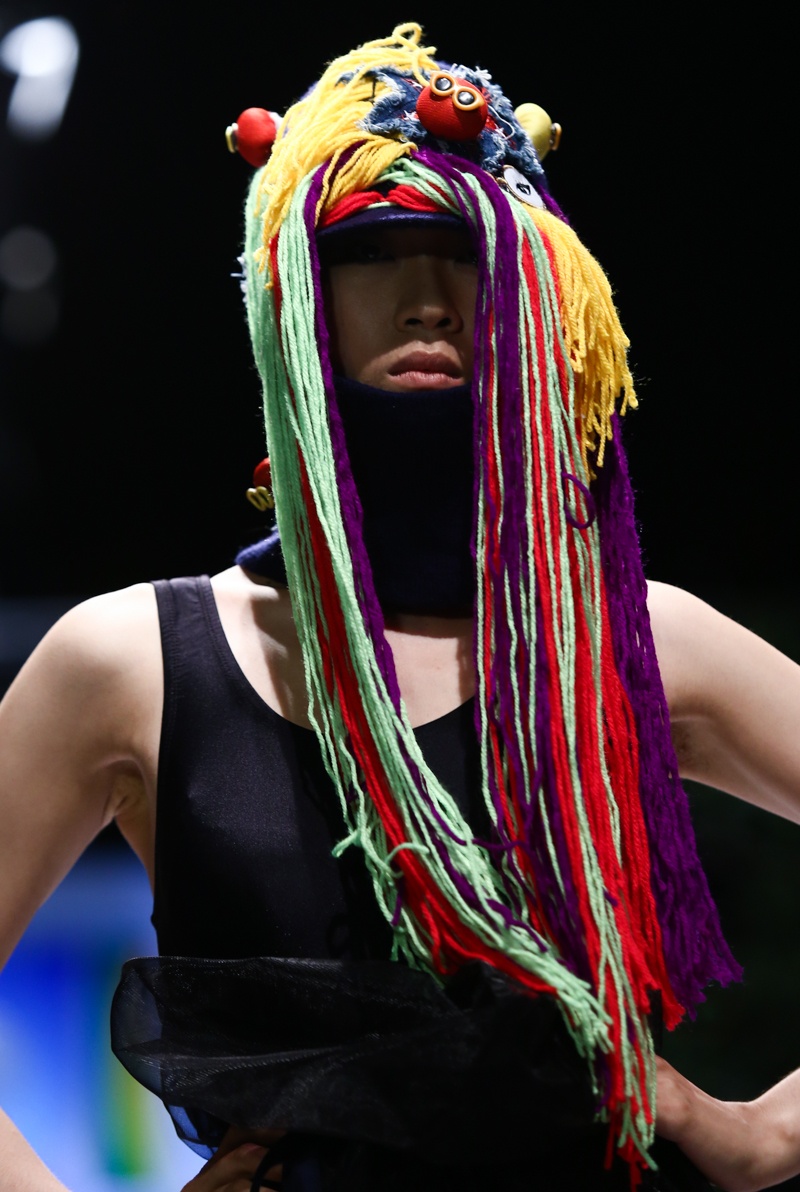 Nữ người mẫu đội một chiếc nón có đường uốn lượn lạ mắt.