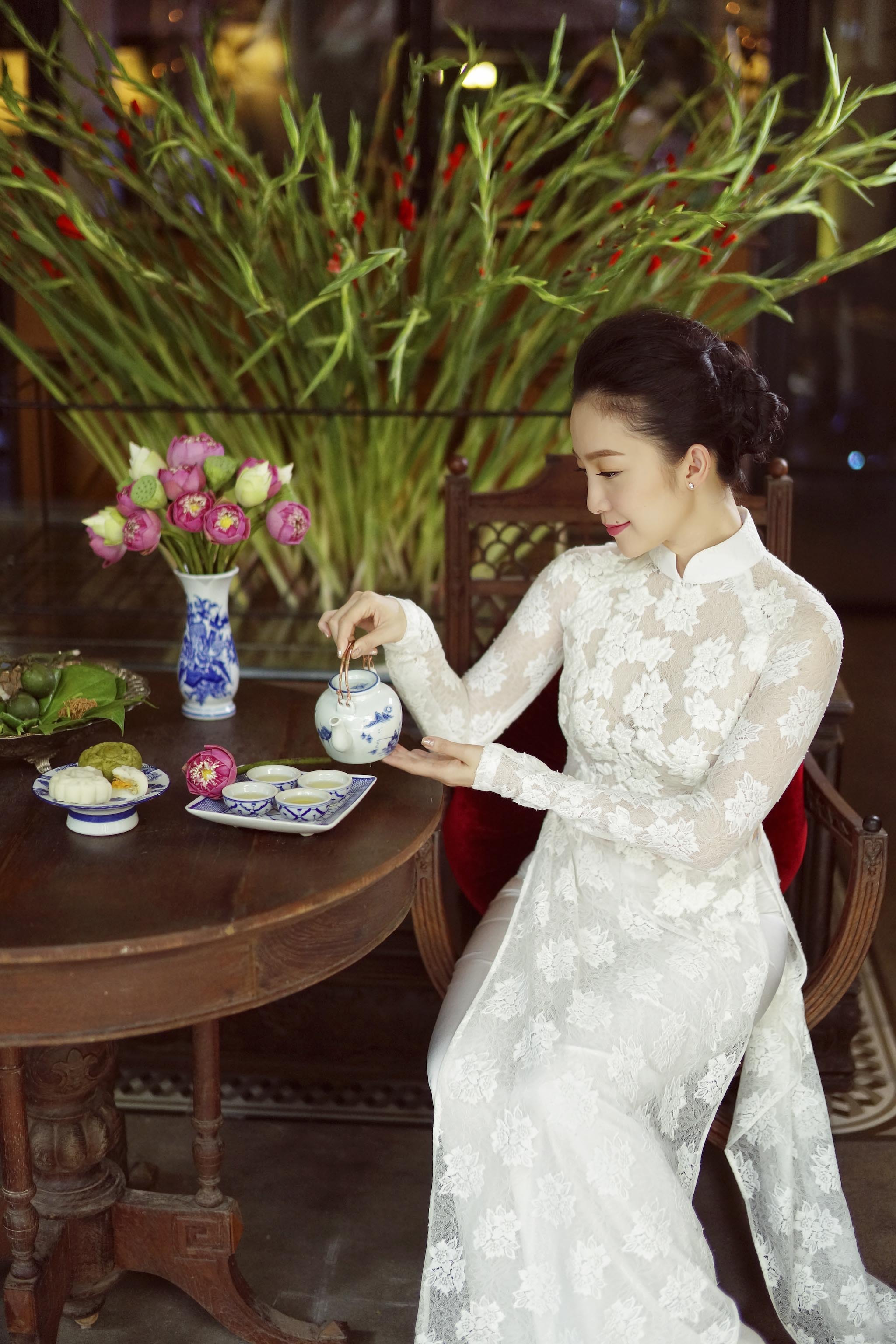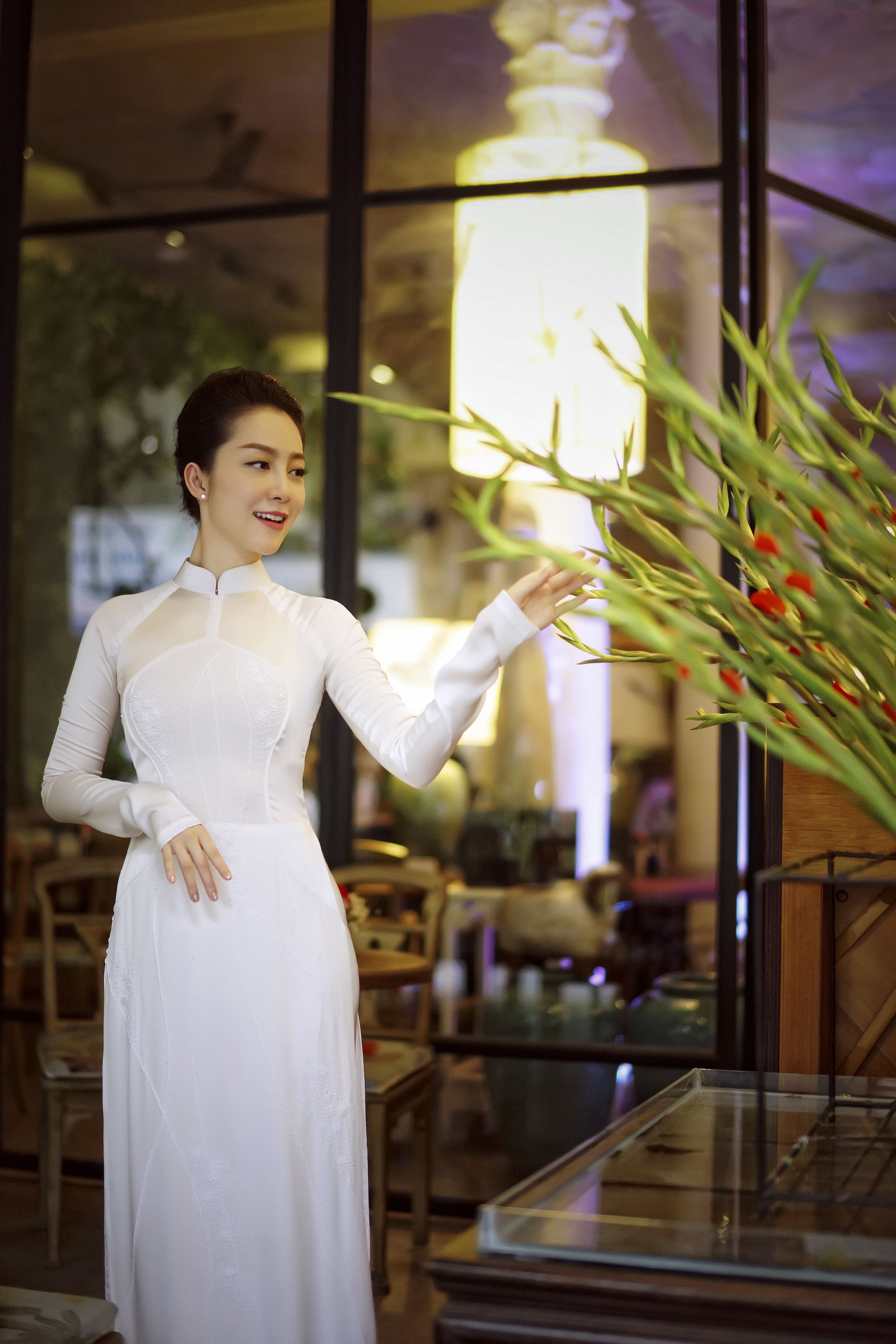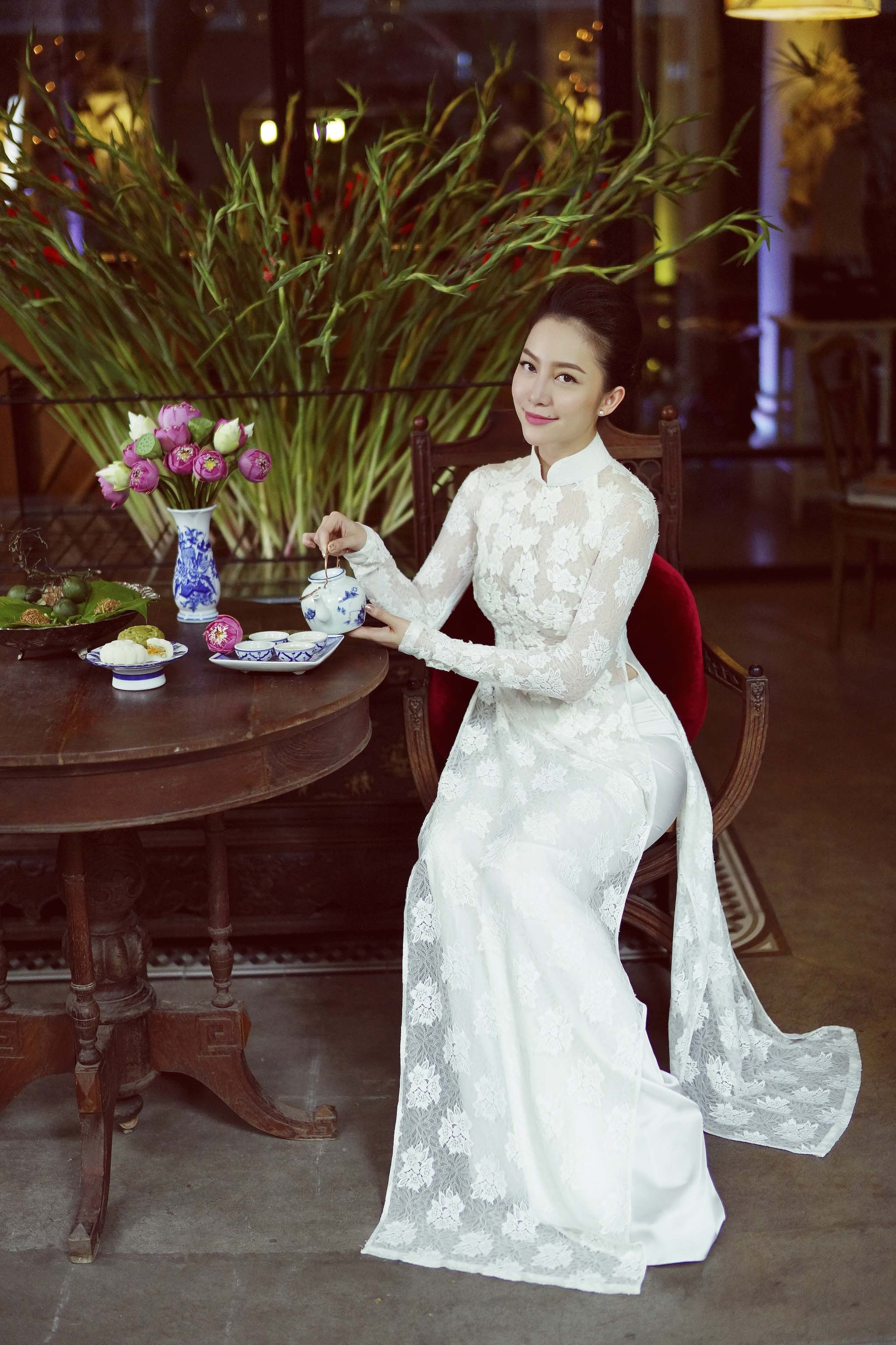 Linh Nga duyên dáng áo dài ren tinh khôi