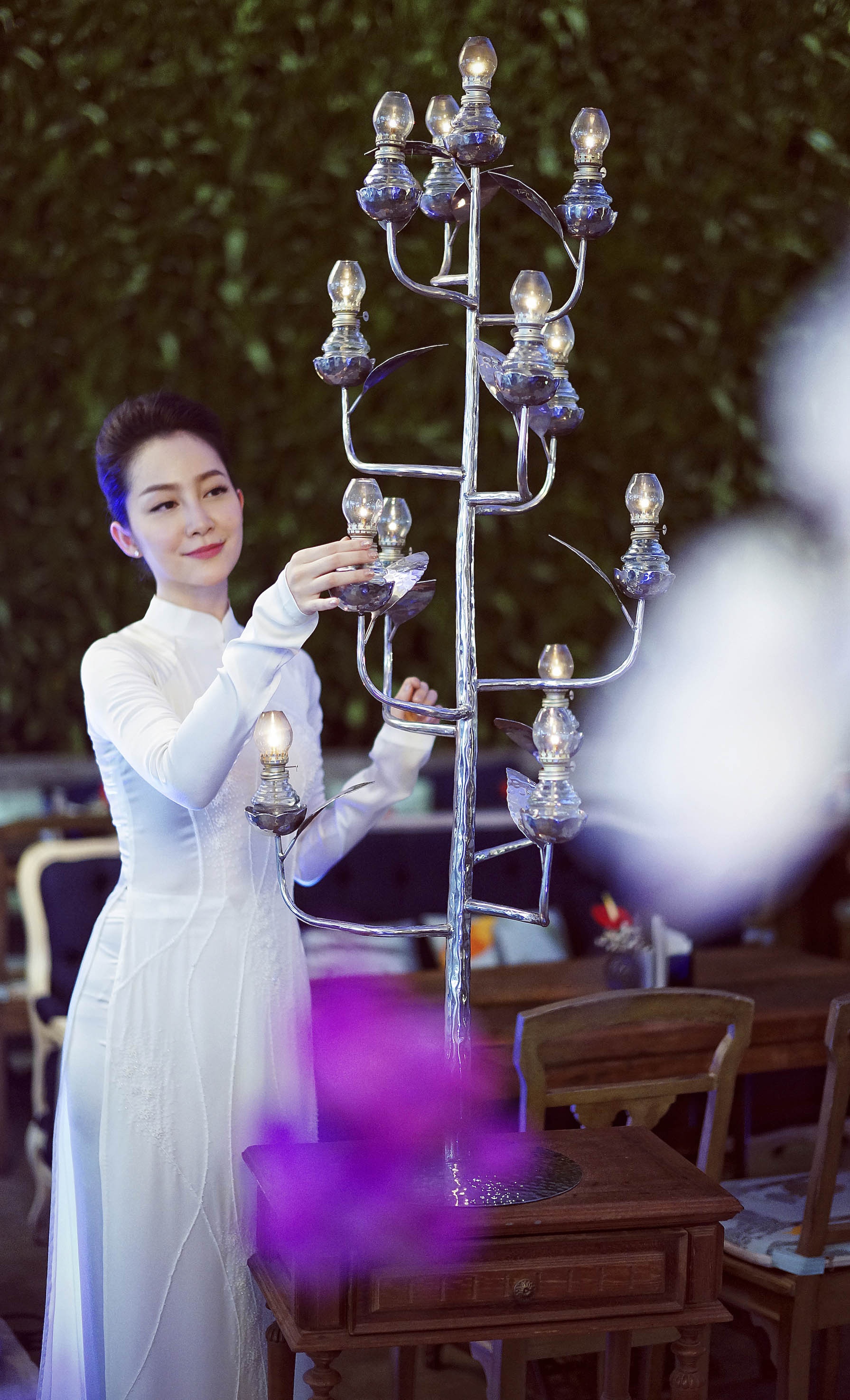 | Trong bộ ảnh mới, Linh Nga thể hiện bộ sưu tập áo dài của NTK Trương Thanh Hải. Người đẹp làng múa diện áo dài ren sắc trắng tựa thiếu nữ xưa trong bối cảnh lãng mạn. |