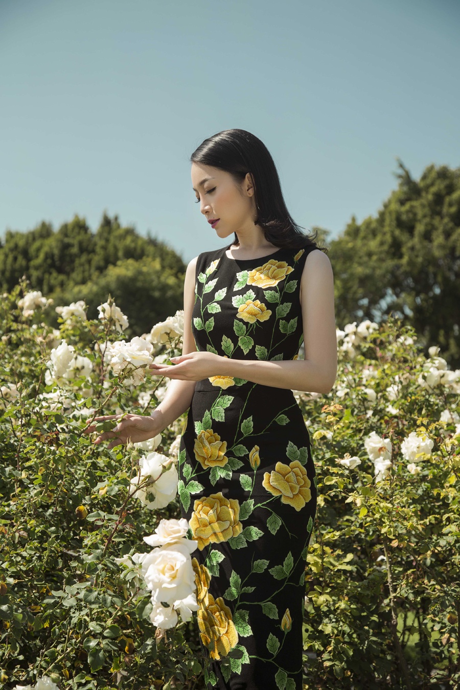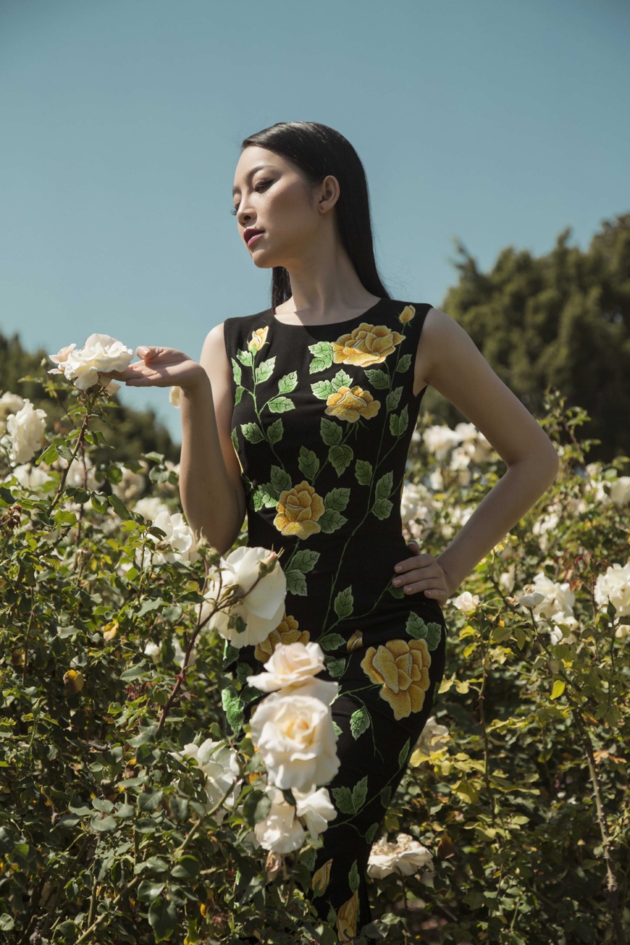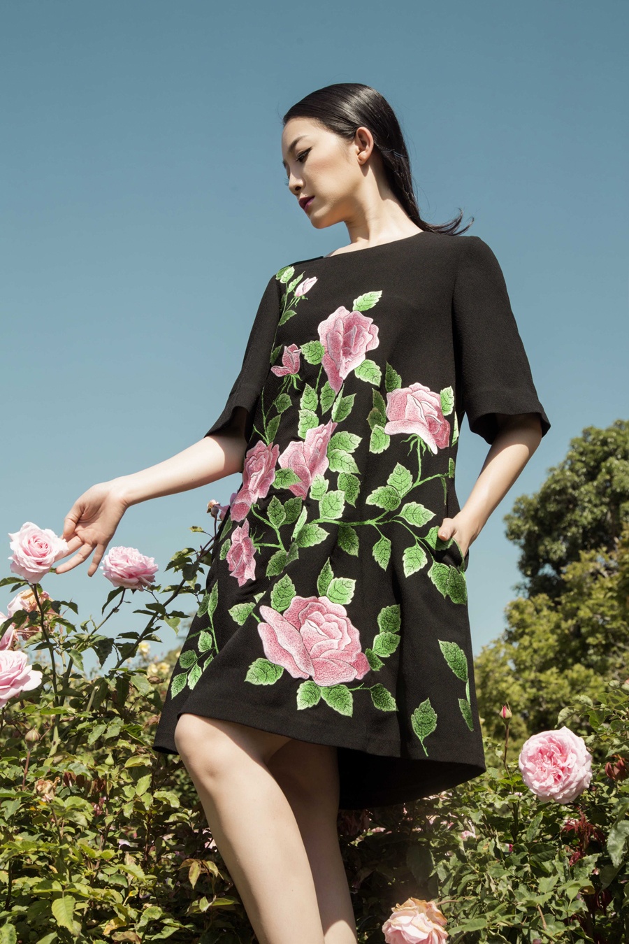 Bộ váy lấy cảm hứng từ hoa hồng được thêu tinh xảo trên nền vải tối màu. Người đẹp làng múa tự tin khoe dáng cân đối trong bộ cánh ôm trọn đường cong. Bối cảnh chụp là khu vườn hoa hồng nằm ở ngọn đồi Beverly Hills (Mỹ) giúp những khung hình thêm phần lãng mạn.