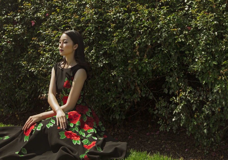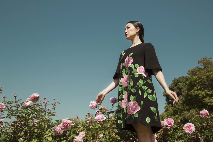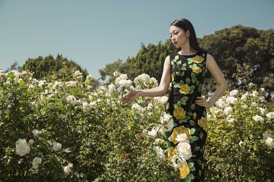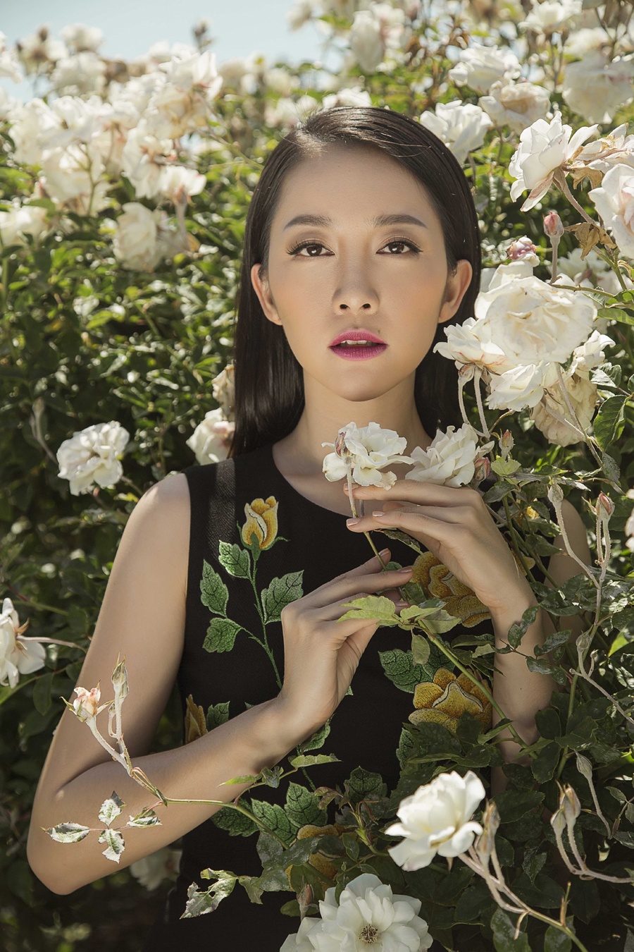 Bộ váy lấy cảm hứng từ hoa hồng được thêu tinh xảo trên nền vải tối màu. Người đẹp làng múa tự tin khoe dáng cân đối trong bộ cánh ôm trọn đường cong. Bối cảnh chụp là khu vườn hoa hồng nằm ở ngọn đồi Beverly Hills (Mỹ) giúp những khung hình thêm phần lãng mạn.