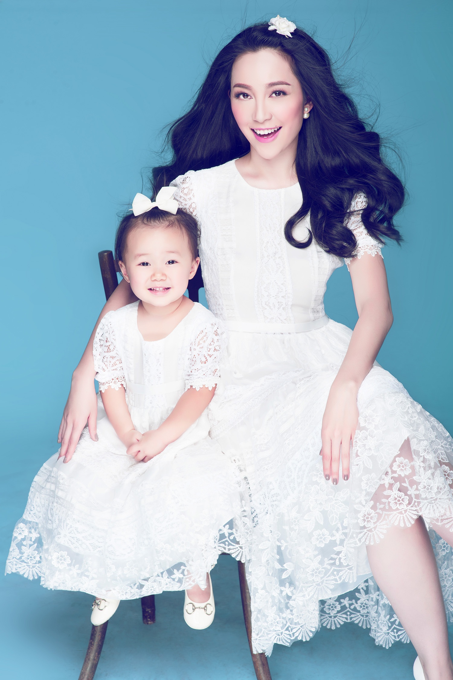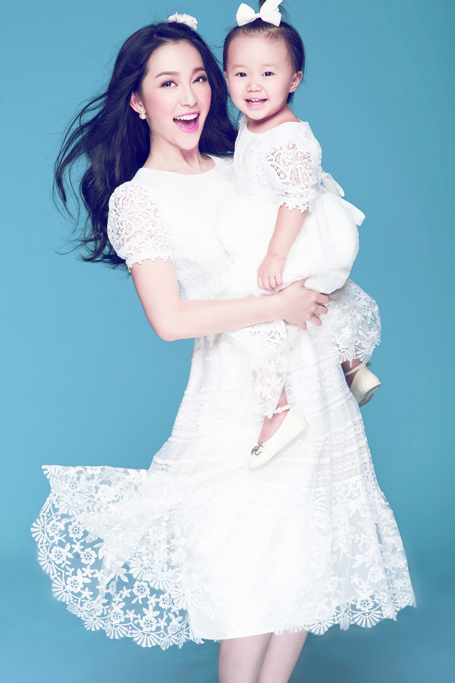 "Chim công làng múa" và con gái cưng trông đáng yêu, thân thiện khi diện trang phục đôi "mẹ và bé" tông trắng tinh khiết.