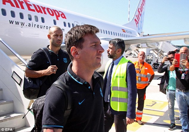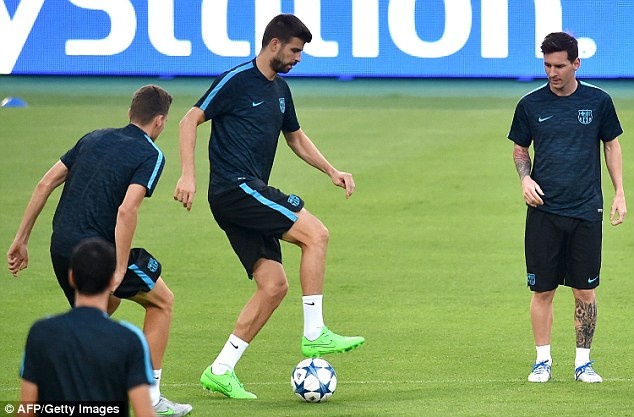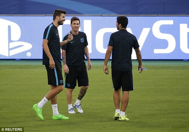| Lionel Messi cùng đồng đội sẵn sàng cho trận gặp đội chủ nhà AS Roma trên sân Stadio Olimpico. Anh trao đổi với trung vệ Pique và tiền đạo Luis Suarez. |
