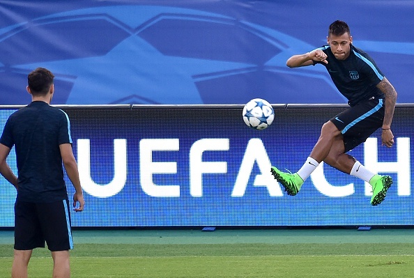 | Tiền đạo Neymar biểu diễn kỹ thuật trong buổi tập của gã khổng lồ xứ Catalan trước trận gặp AS Roma. |