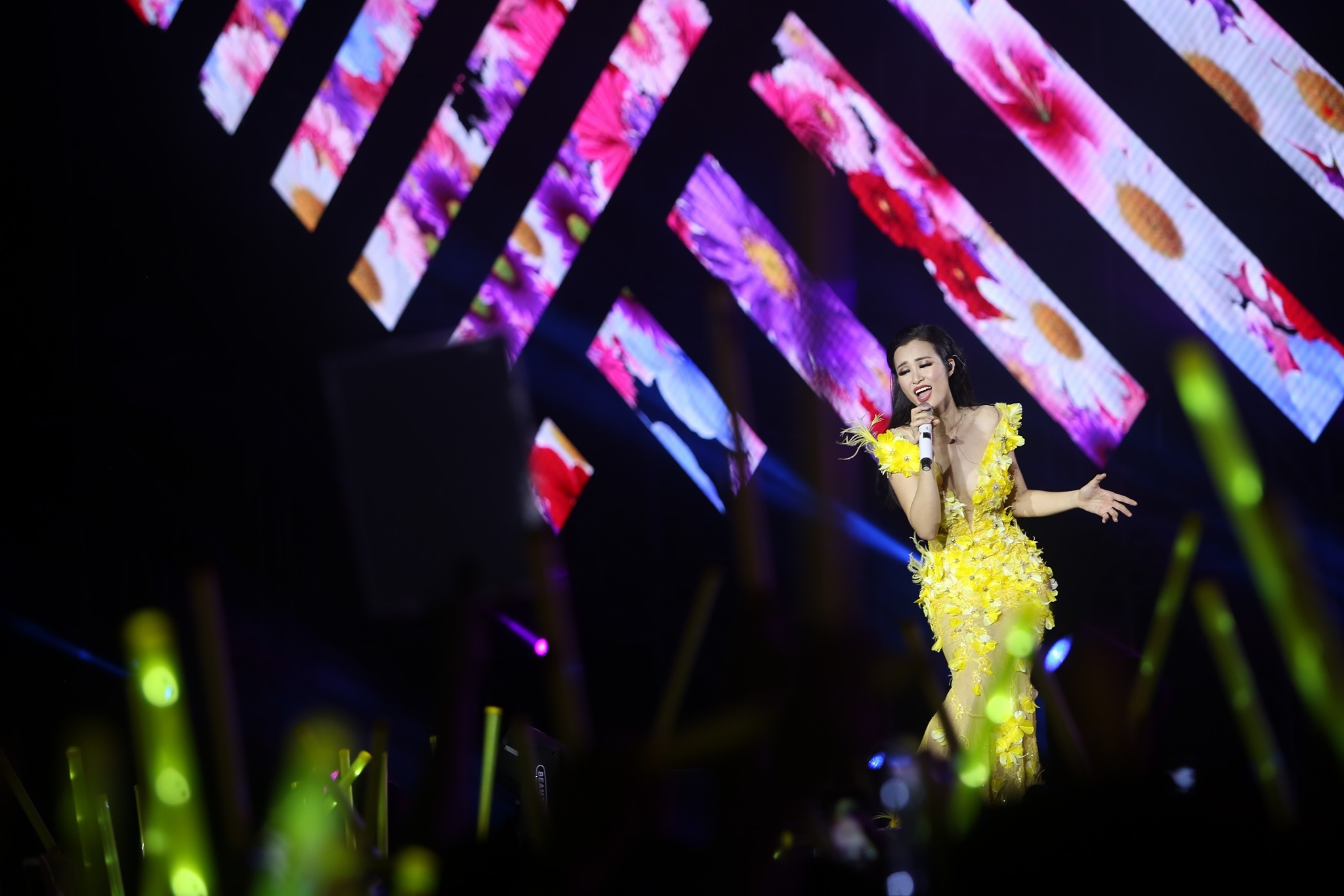 Diện chiếc đầm dài lộng lẫy, nữ ca sĩ chuyển sang phong cách ballad nhẹ nhàng. Mỗi bài hát của cô fan đã thuộc lòng nên mọi người trong khán đài đều hòa giọng tạo nên không khí ấm áp.