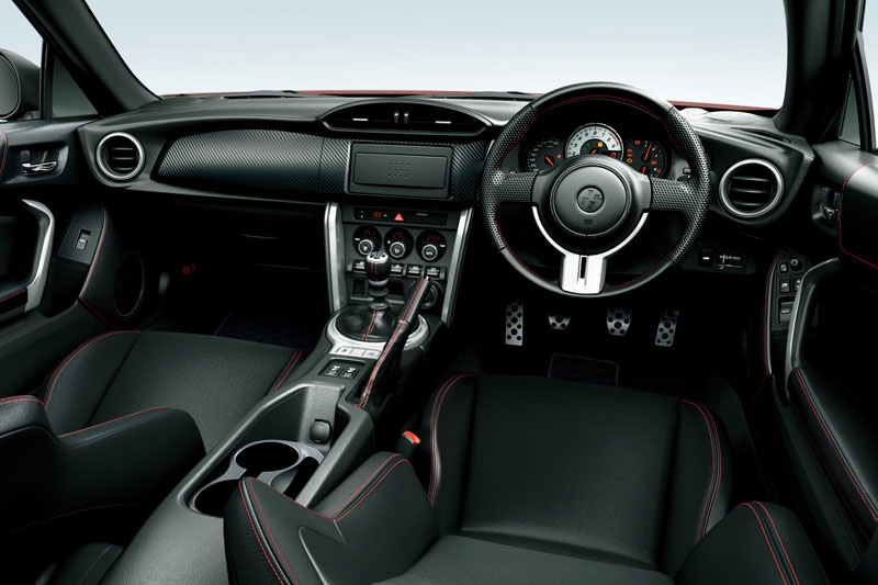 Nội thất của phiên bản GT86 Limited được trang bị nhiều chi tiết màu đỏ trên ghế ngồi, vô lăng, tay nắm phía trong cửa, phanh tay và cần số. Toàn bộ chỉ thêu bên trong cabin xe cũng mang màu đỏ.