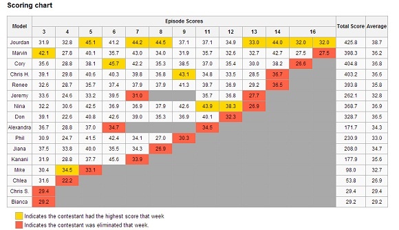 | Điểm số của 16 thí sinh qua các tập, Jourdan giữ kỉ lục với 7 lần chiến thắng “Best Photo”. |