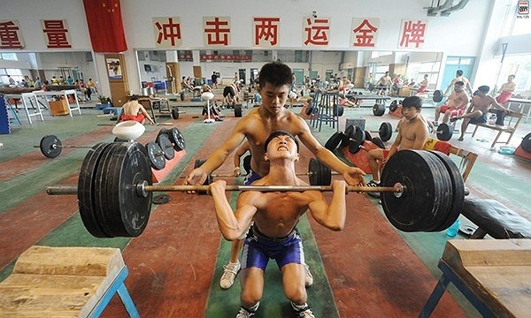 | Tập luyện cùng đàn anh. Môn cử tạ là trọng tâm Olympic của đoàn Trung Quốc. |