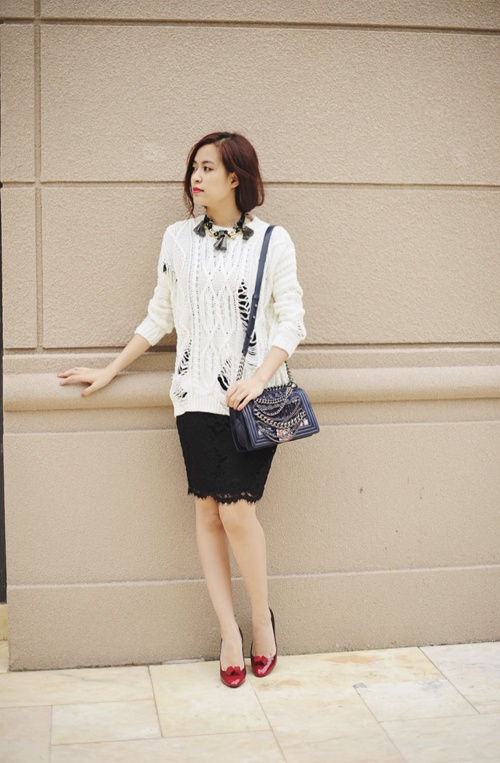 | Đã có nhiều nhận xét về gu thời trang trình diễn diêm dúa và kém sang trọng của Hoàng Thùy Linh trên sân khấu. Tuy nhiên, cũng không có ít lời khen ngợi về phong cách thời trang đường phố rất trẻ trung và giản dị của cô ca sĩ xinh đẹp. Đặc biệt trong những ngày đông, Hoàng Thùy Linh liên tiếp ghi điểm với cách kết hợp áo len hết sức đáng yêu. Áo len trắng được cô mix kèm váy ren đơn giản và không kém phần thanh lịch. |