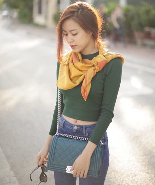 | Áo len crop top mix màu rất sành điệu cùng túi Chanel. Điểm nhấn của bộ trang phục chính là chiếc khăn quàng lệch rất thu hút. |