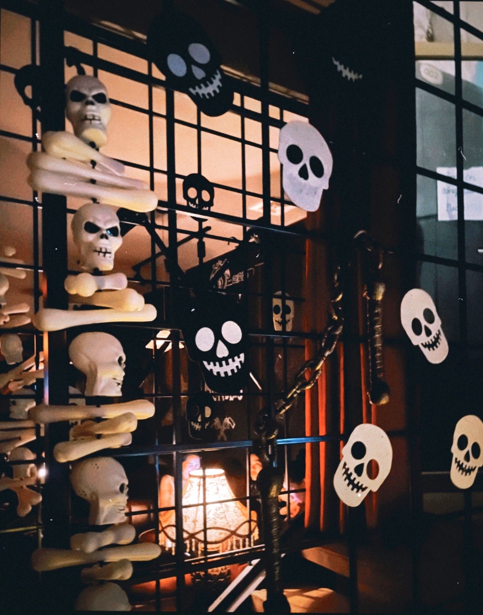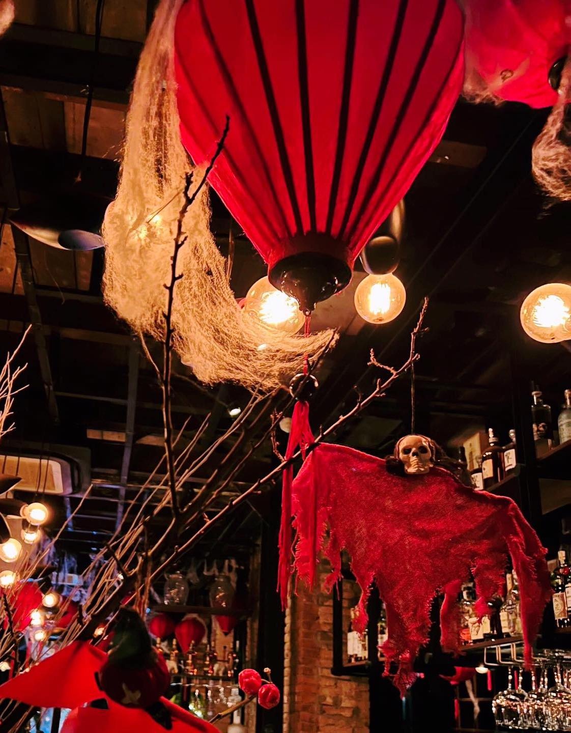 - Dịp Halloween, tiệm trang trí hình ma, đầu lâu hay mạng nhện. Ánh sáng vàng mờ ảo đan xen đèn lồng đỏ treo cao làm tăng vẻ ma mị.