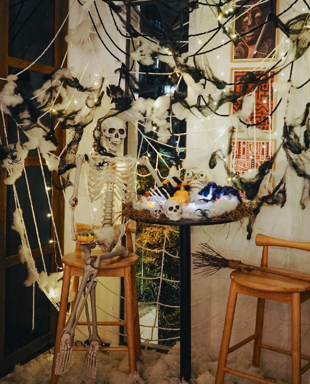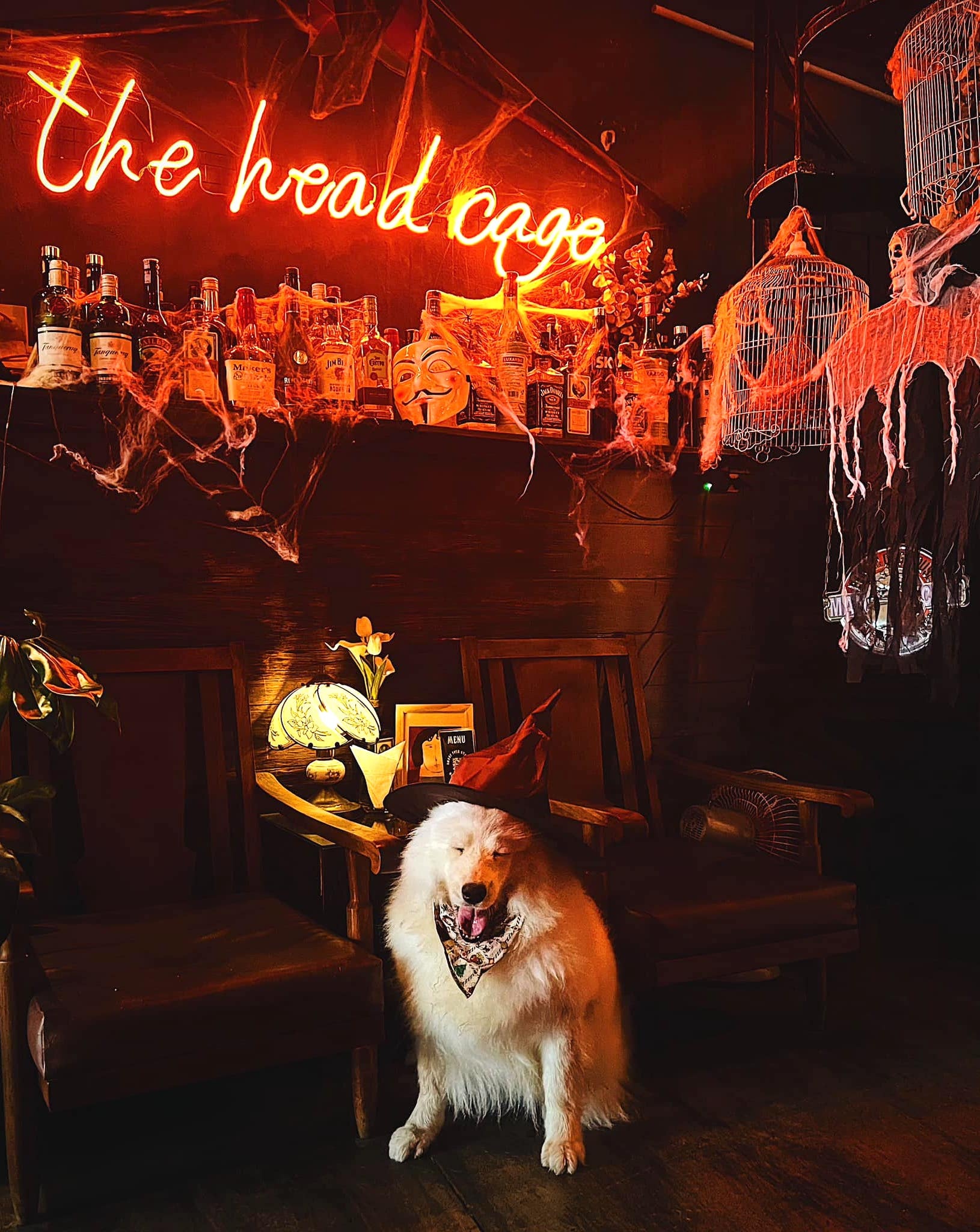 - Nơi đây trang trí concept Halloween đơn giản, gần gũi. Ánh sáng dịu nhẹ, đèn neon làm điểm nhấn mang đến khung cảnh có phần huyền bí.
