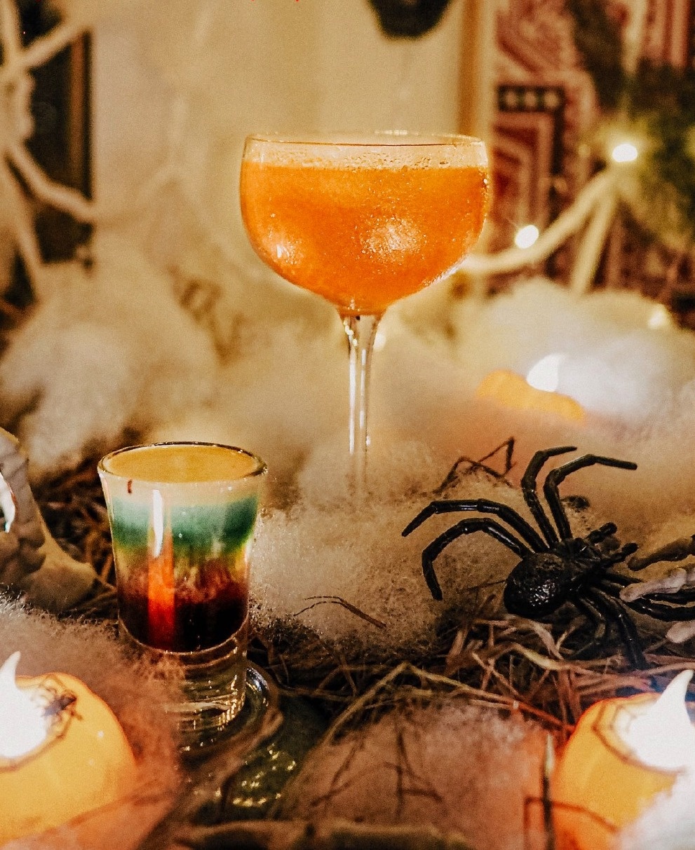 - Quán trang trí góc chụp hình Halloween lạ mắt. Dịp lễ cuối tháng 10, bạn sẽ được tặng shot Brainiac nếu mặc đồ hóa trang và check-in tại quán.