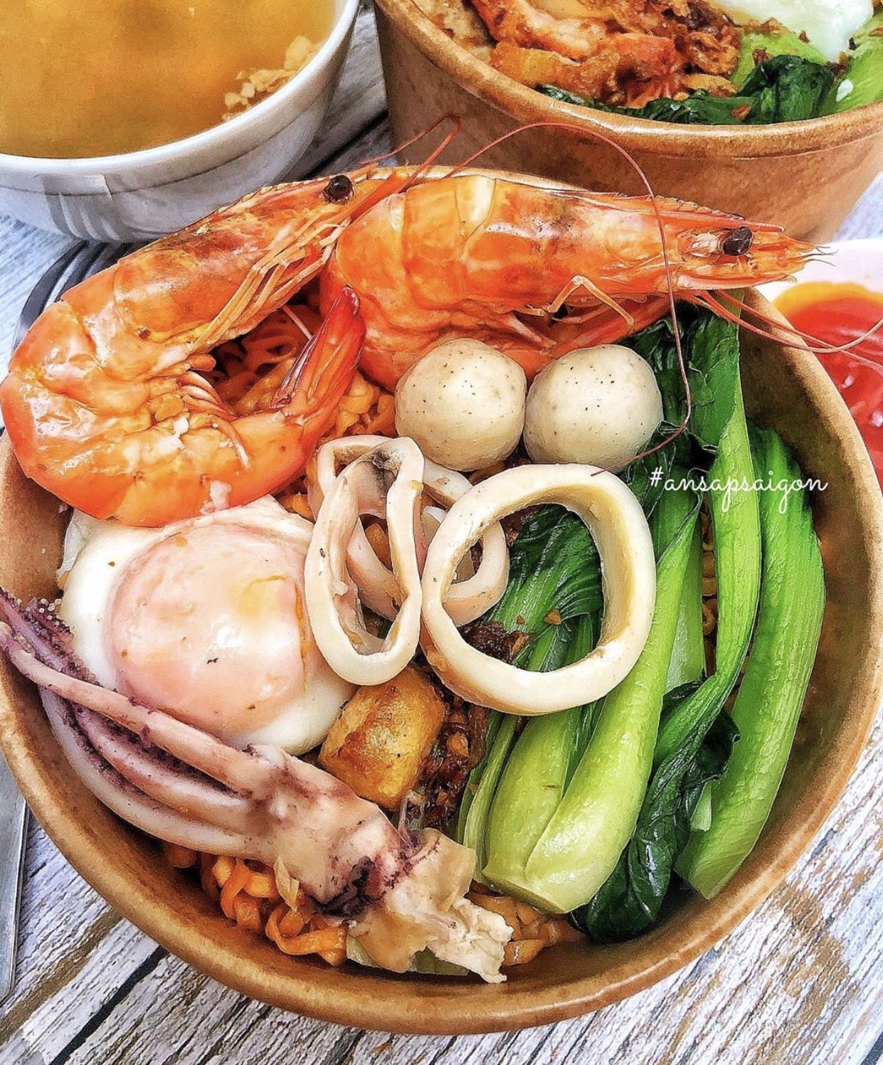 Mì là món ăn quen thuộc mà bạn có thể thỏa mãn chiếc bụng đói sau một ngày làm việc. Tiệm Mì Trộn Tên Lửa là nơi hút giới sành ăn với phiên bản mì hải sản hấp dẫn. Tô mì được chuẩn bị chất lượng với tôm, mực, cá viên, trứng lòng đào. Ngoài ra, phần nước súp nóng hổi ăn kèm cũng làm bữa ăn thêm tròn vị. Ảnh: Ansapsaigon, Hetagram_. |