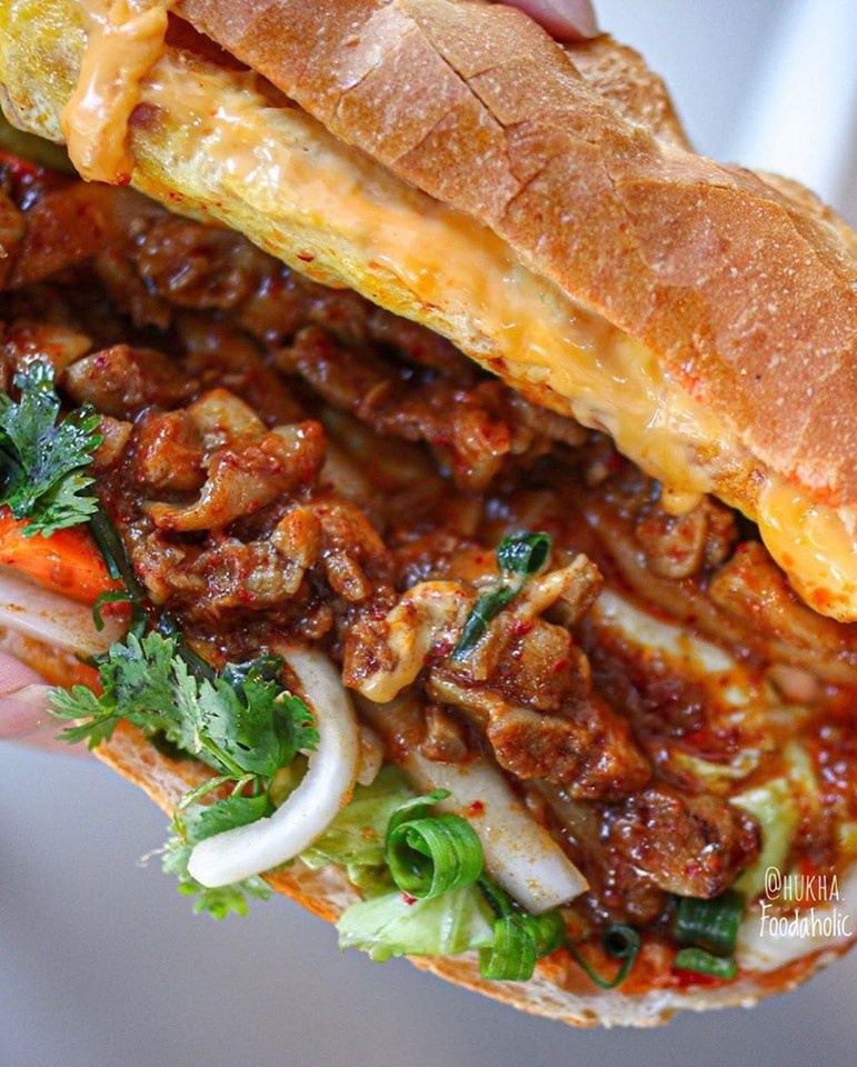 Một thực khách chia sẻ: "Bánh mì heo cay phủ phô mai King size có nhân nhiều, gia vị được nêm vừa miệng. Mức giá khá cao nhưng chất lượng tương xứng. Bạn cũng có thể thử bánh mì gà sốt cay thơm ngon không kém". Ảnh: Lanwiththi, Hukhafoodaholic. |