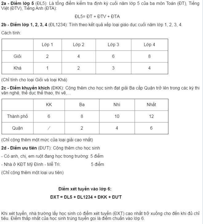 Trường THCS Cầu Giấy: Dựa trên kết quả học bạ 5 năm, thành tích học sinh đạt được ở các cuộc thi về học tập, văn hóa văn nghệ. Những tiêu chí này sẽ được quy ra điểm và lấy từ cao xuống thấp.