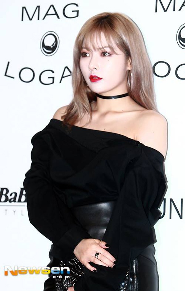 | HyunA sexy cùng áo sơ mi trễ vai, choker bản lớn và lối trang điểm đậm. |