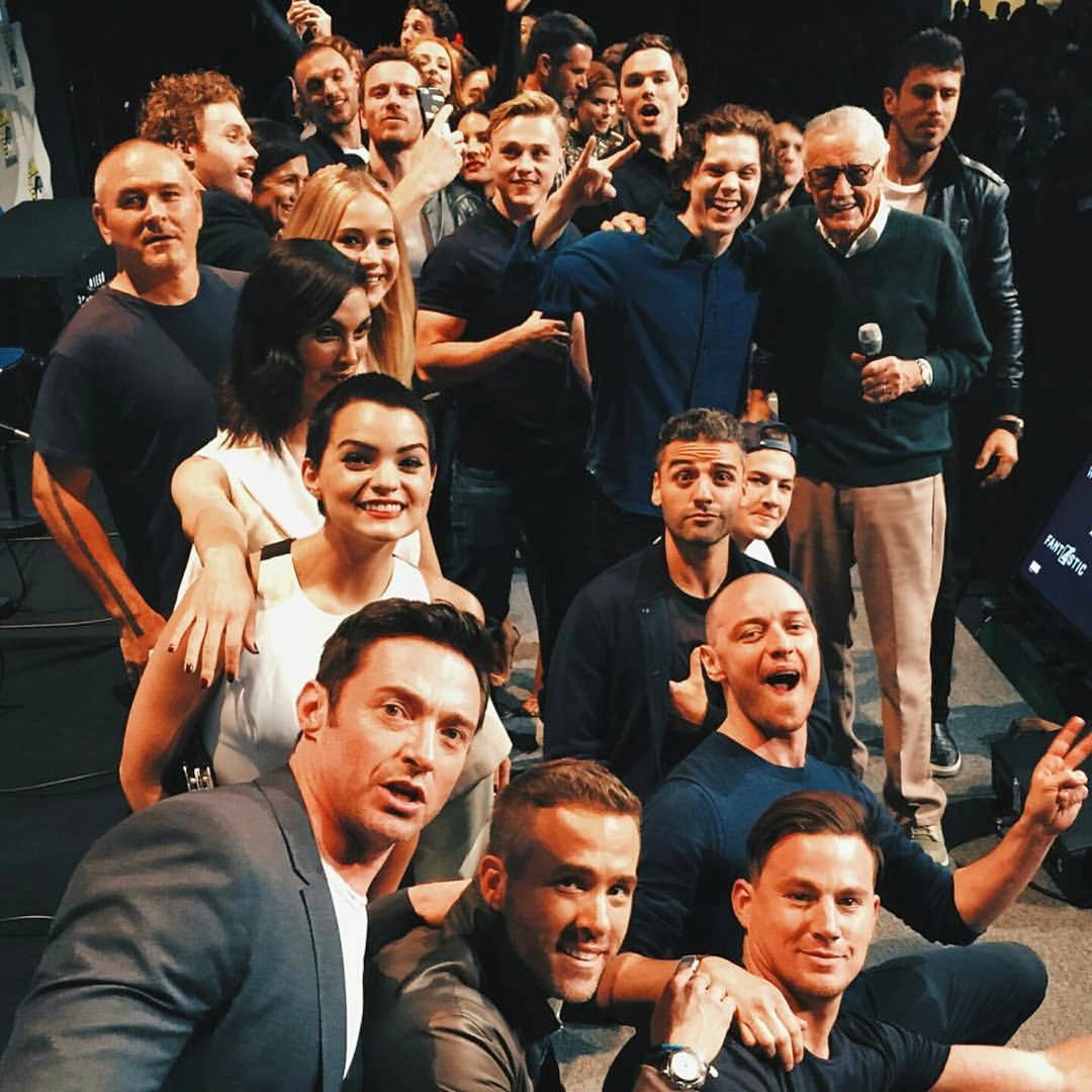 | Stan Lee chụp ảnh selfie cùng dàn sao siêu anh hùng của 20th Century Fox. |
