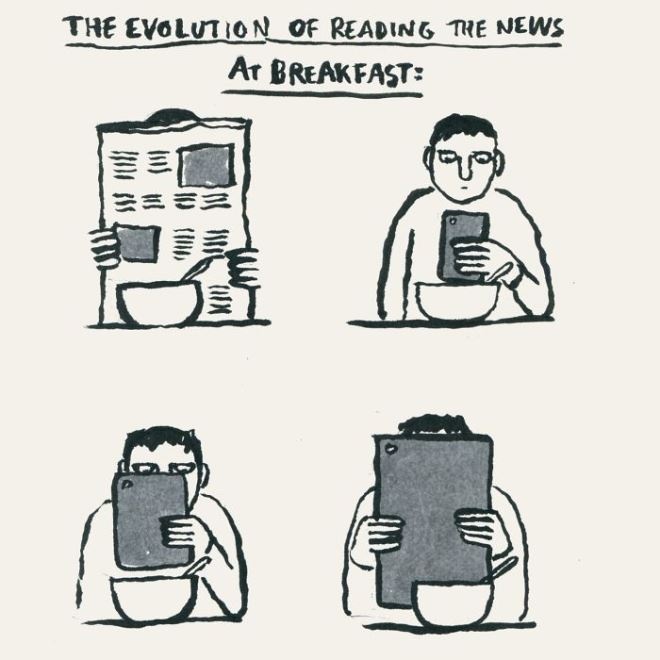 | Theo Bored Panda, họa sĩ Pháp Jean Jullien đã cho ra mắt loạt tranh biếm họa dí dóm về sự lệ thuộc công nghệ thời hiện đại. Bức tranh đầu tiên là quá trình thay đổi thói quen xem tin tức trong bữa sáng hàng ngày từ báo giấy sang smartphone. |