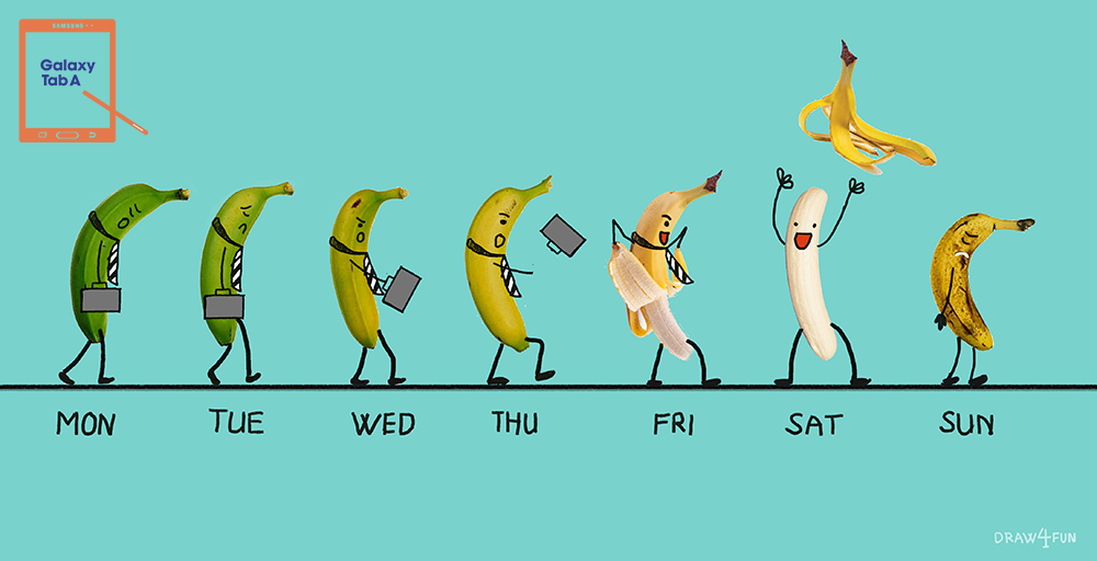 | Chắc hẳn bạn cũng đôi lần thao thao bất tuyệt nói xấu sau lưng sếp mà không biết người ấy đang đứng ngay phía sau. Tận dụng vài quả chuối và óc sáng tạo, tác phẩm của Draw 4 Fun minh họa hài hước tình huống khó xử ấy. |