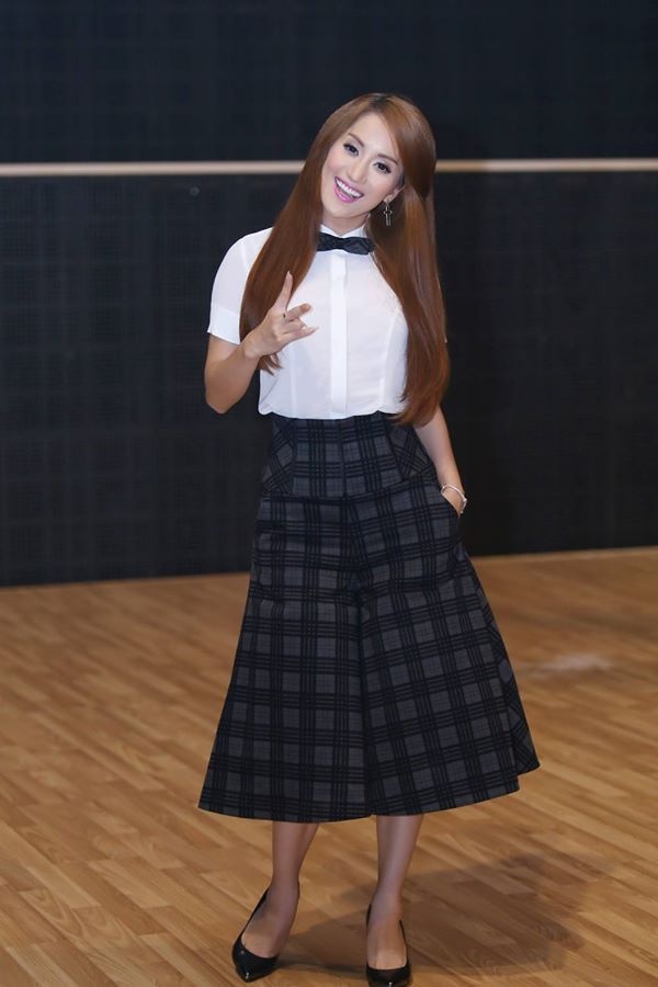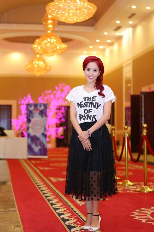 | Hình ảnh mới nhất của Khánh Thi với kiểu váy chuông khiến cho phần dưới cơ thể của cô bị ngắn lại. |