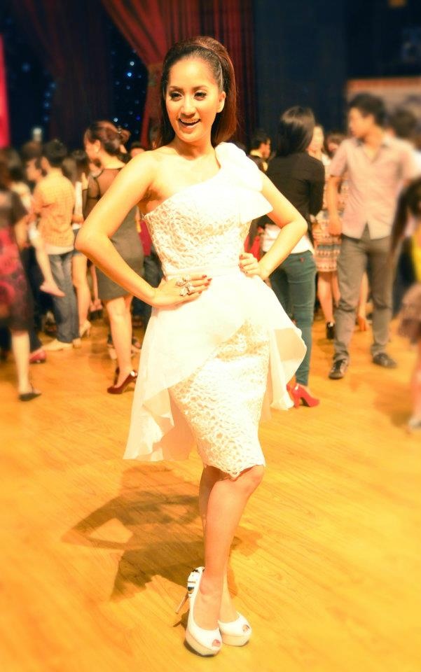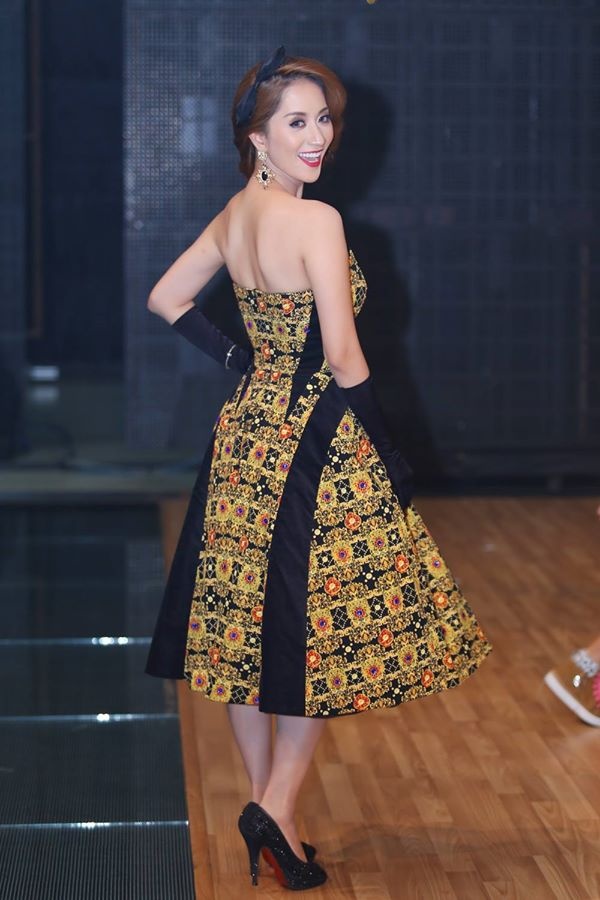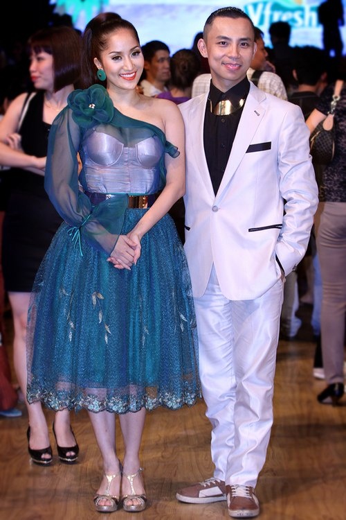 | Thêm một chiếc đầm đẹp nhưng tố cáo chiều cao của Khánh Thi. |