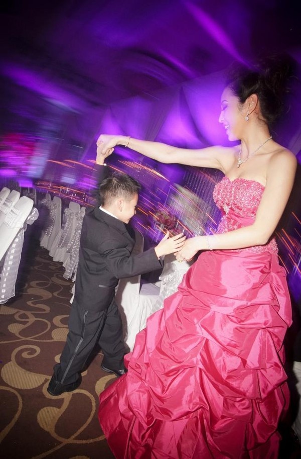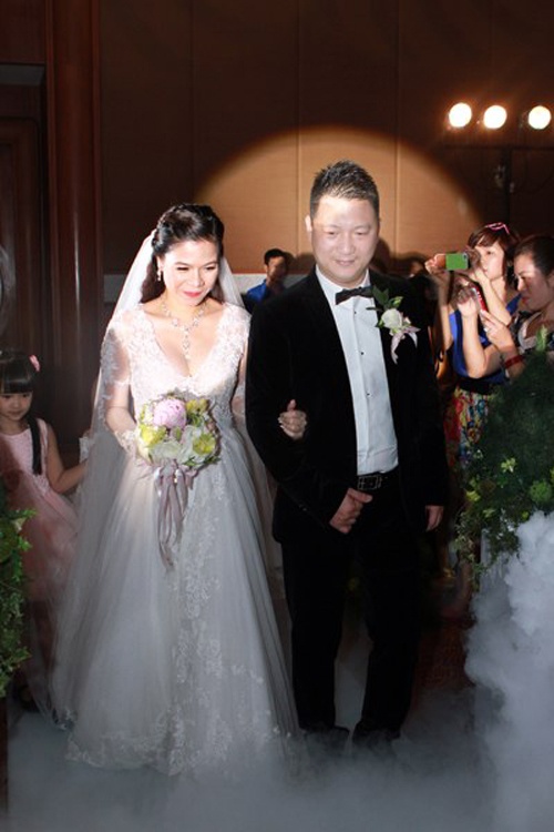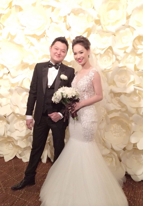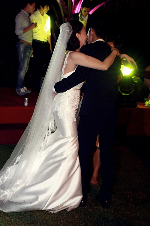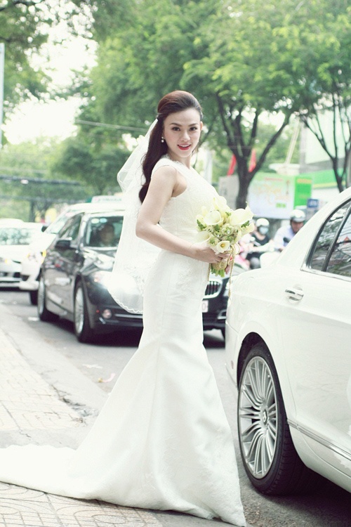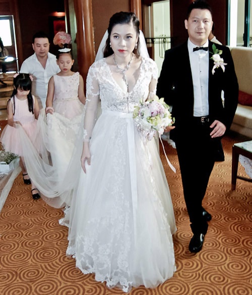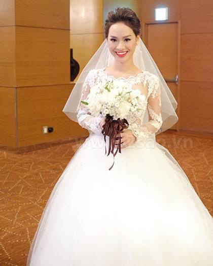 | Ca sĩ Thùy Dung tăng cân khá nhiều trong ngày cưới vì thế chiếc váy cưới ren với phần eo cao giúp cô che nhược điểm khá tốt. |