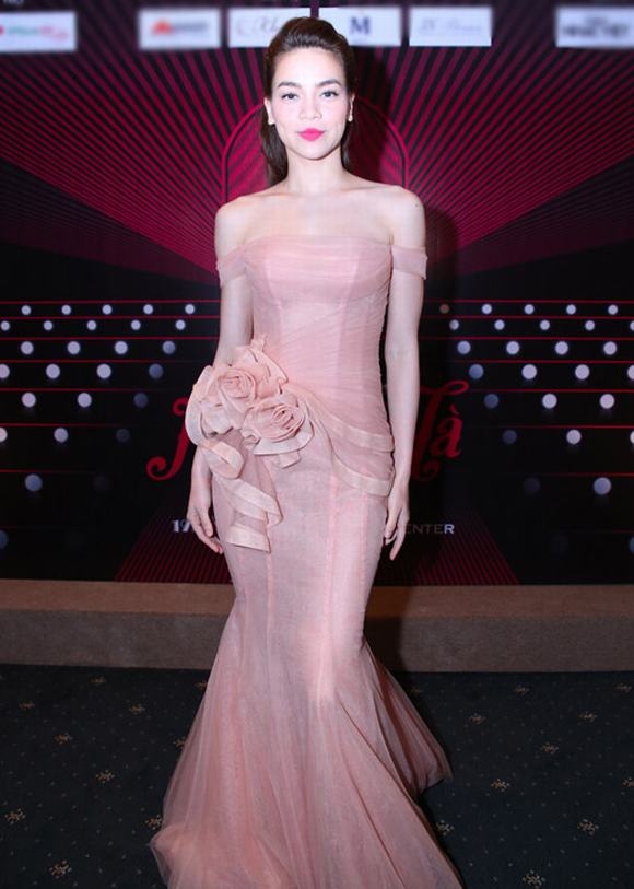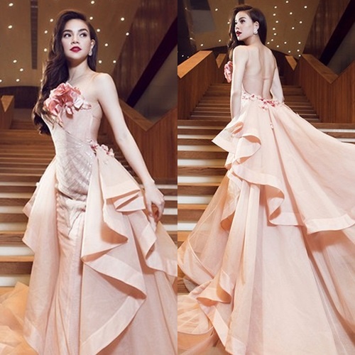 | Hình ảnh giám khảo The Remix trong mẫu đầm dạ hội lộng lẫy có tông màu be hồng. |