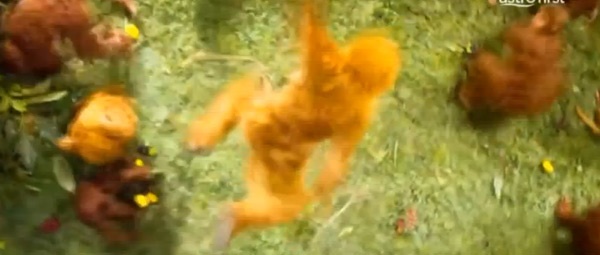 | Lúc Tôn Ngộ Không bắt bướm và rơi từ trên cao xuống, bên dưới mặt đất sạch sẽ, nhưng khi tiếp đất, trái cây lại xuất hiện khắp nơi. |
