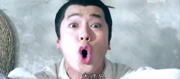 | Tôn Ngộ Không đánh đại sư huynh tơi tả. Ảnh trên, đầu đại sư huynh nằm ngang cái mâm tre, nhưng lúc chuyển cảnh, cái mâm tre lại nằm trên đầu đại sư huynh. |