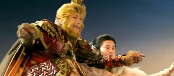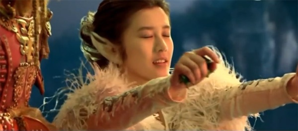 | Nàng tiên nữ này rõ ràng đã được treo bằng 2 sợ dây cáp ở thắt lưng và chân. Động tác căng cứng của cô diễn viên đã khiến cảnh nàng tiên bị đứng hình sau tiếng thét của Tôn Ngộ Không trở nên buồn cười. |
