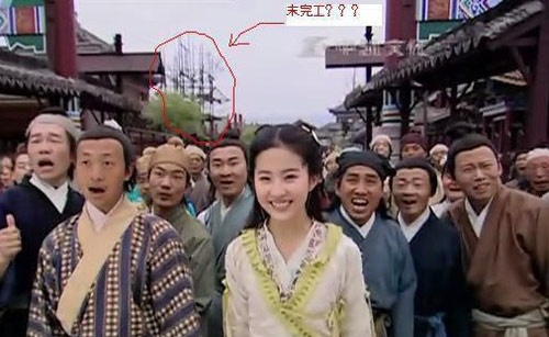 | Dàn giáo công trình xây dựng nhà cao tầng đã lọt vào ống kính trong một cảnh quay của bộ phim Tiên kiếm kỳ hiệp. Đây cũng là một lỗi bị dân mạng chê "vô duyên". |