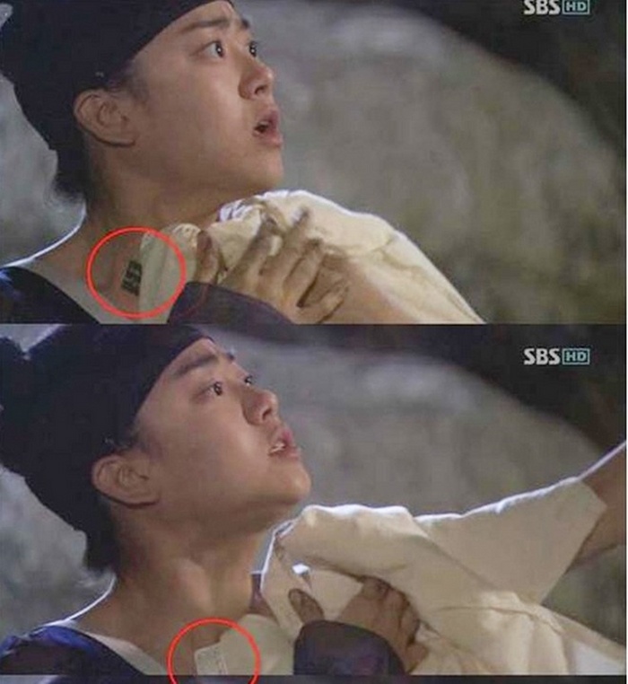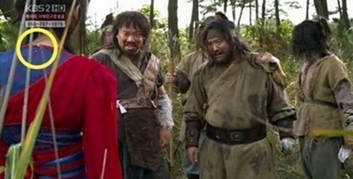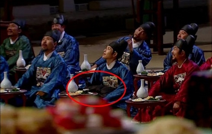 | Nam diễn viên phụ quên giấu áo phao thời hiện đại đặt trên đùi trước khi ghi hình. |
