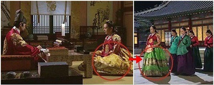 | Trong phim truyền hình nổi tiếng Mặt trăng ôm mặt trời, khi trò chuyện với Vua, Hoàng hậu mặc trang phục màu vàng nhưng khi ra về lại chuyển sang màu xanh. |