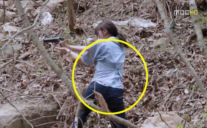 | Chiếc áo Ha Ji Won rộng thùng thình đến nỗi phải buộc tạm bằng kim băng. |