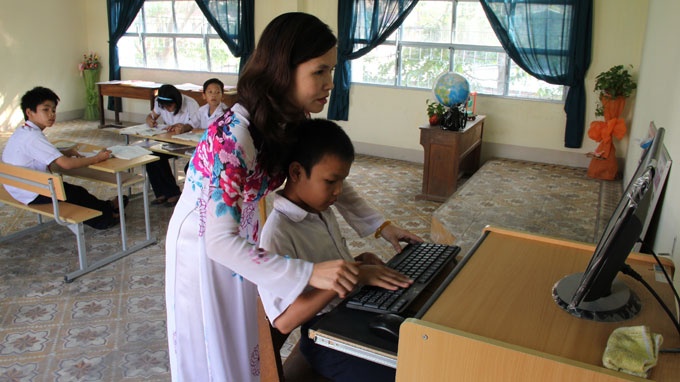 Cô giáo ngồi quây quần bên các em rồi hỏi: “Các em muốn học môn gì nào?”. Trần Văn Khánh (lớp 3/1) nhanh nhảu đáp: “Em muốn học máy tính để tự viết tên mình trên máy”. Cô Chính nhẹ nhàng khởi động chiếc máy tính, cô mở Word, sau đó hướng dẫn Khánh cách viết có dấu tên mình.