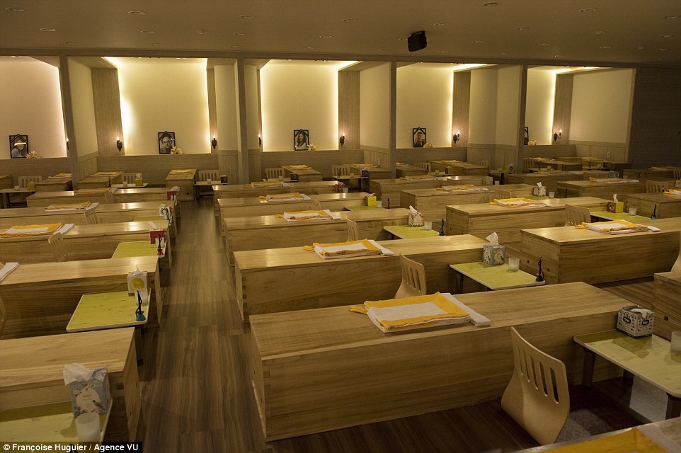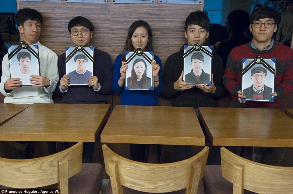 | Một cô gái mặc trang phục tang, cầm khung ảnh lồng chính bức hình của cô, nằm yên trong quan tài và giả chết. Một số trung tâm ở thủ đô Seoul đã xây dựng các khóa học "trải nghiệm cái chết" nhằm giúp thanh niên cảm nhận cái chết, từ đó giúp họ yêu quý cuộc sống hơn. |