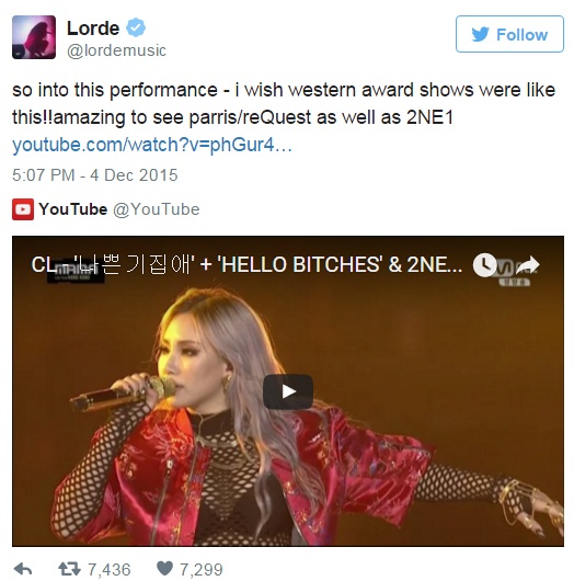 Giọng ca tài năng người New Zealand viết: "Phát cuồng với CL. Cô ấy thật ngọt ngào, tuyệt vời và cực ngầu. 100% là ngôi sao". Ngay sau đó, Lorde chia sẻ phần trình diễn của CL và 2NE1 tại lễ trao giải MAMA 2015 ngày 2/12 cùng lời bình luận: "Thật đắm chìm với phần trình diễn này - tôi ước các lễ trao giải phương tây cũng được như thế! Thật tuyệt khi được xem parris/reQuest (vũ công trong phần trình diễn của CL) cũng như 2NE1".