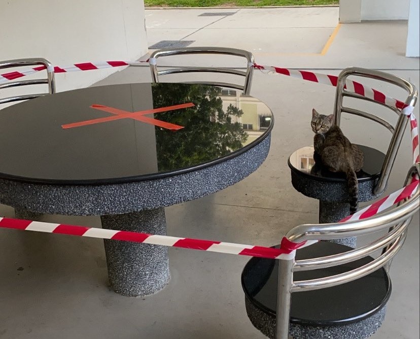 | Ngày 10/4, tài khoản @hzqhsrn đã bắt đầu một một chủ đề trên Twitter về những chú mèo nằm trên bàn ghế công cộng, bất chấp những dải băng niêm phong xung quanh tại Singapore. Bức ảnh này bắt đầu tạo ra một trào lưu mới, khoe ảnh loài thú cưng "ngang nhiên" chiếm vị trí vốn dành cho con người trước dịch Covid-19. |