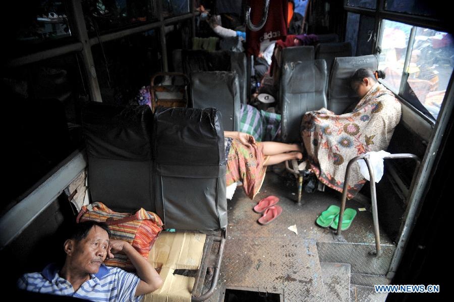 | Hàng chục người lánh nạn trên một xe bus hỏng. Ảnh: Tân Hoa Xã |