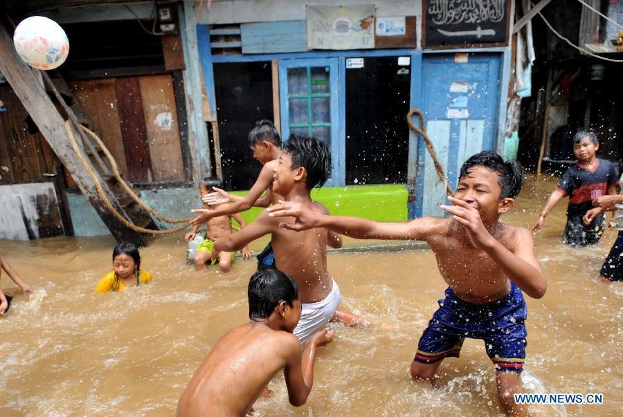| Lũ trẻ chơi đùa với bóng trên một phố ở Jakarta. Ảnh: Tân Hoa Xã |