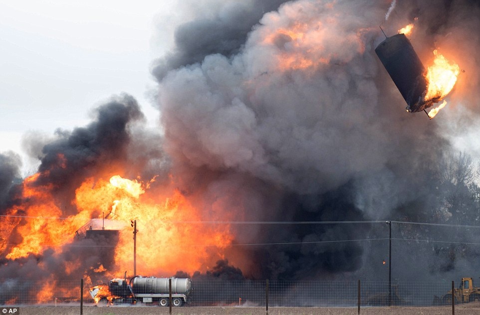 Lửa lan khắp cabin của một xe tải trong nhà máy. Dale Lyman, người phát ngôn của Sở Cứu hỏa thành phố, cho biết, lính cứu hỏa tới hiện trường vụ sét đánh sau 13h (theo giờ địa phương). Họ phối hợp với tập đoàn NGL Energy Partners, chủ sở hữu nhà máy, để tìm phương pháp xử lý. Nguy cơ nổ vẫn tiềm ẩn nên lực lượng cứu hỏa phải chờ tới khi lửa dịu bớt mới chữa cháy. Ảnh: AP