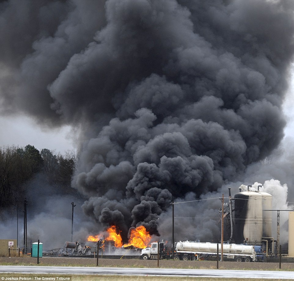 Cột khói bốc lên tại khu vực chứa nước thải. Ông Doug White, phó chủ tịch tập đoàn NGL Energy Partners, thông báo rằng lực lượng cứu hỏa dập tắt ngọn lửa trong ngày 17/4. Ảnh:The Greeley Tribune
