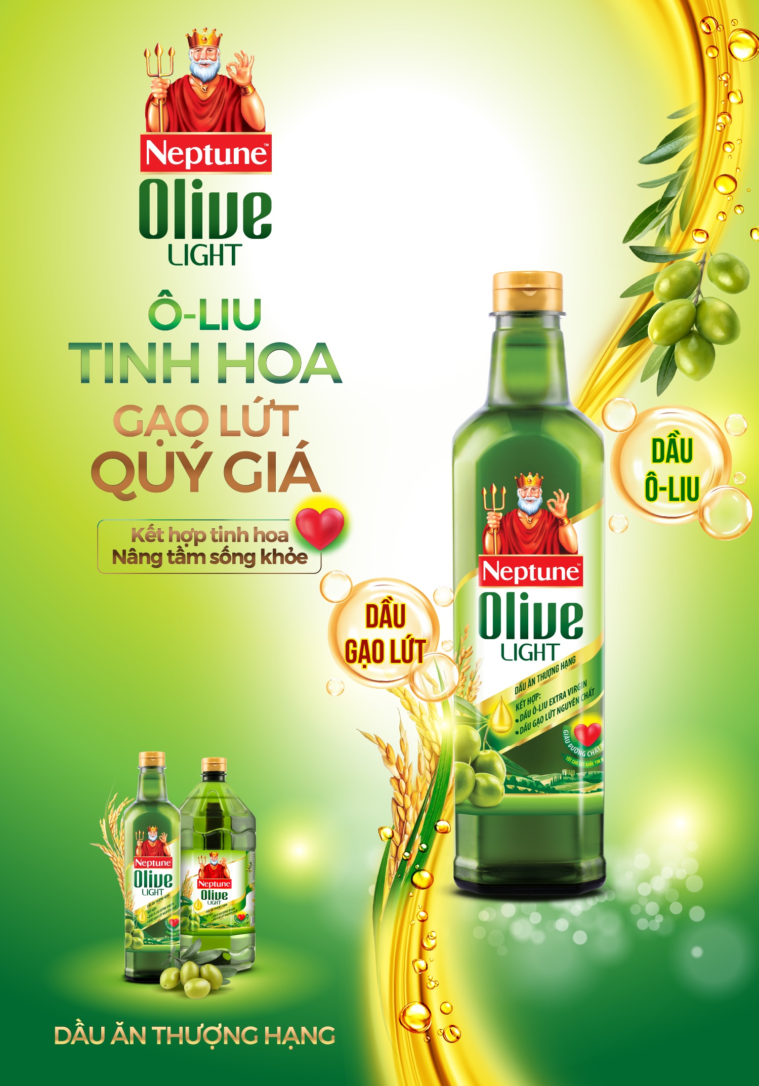 Dầu ăn thượng hạng Neptune Olive Light là sự kết hợp độc đáo giữa dầu ô-liu Extra Virgin và dầu Gạo lứt nguyên chất. Việc sử dụng dầu ô-liu Extra Virgin từ lâu được xem như một phần không thể thiếu trong nhiều hướng dẫn về chế độ ăn lành mạnh. Trong kim tự tháp chế độ ăn Địa Trung Hải (Mediterranean Diet Pyramid - một mô hình dinh dưỡng được xây dựng có sự tham gia của WHO cùng Harvard và Oldways Preservation Trust) dầu ô-liu được đặt ở vị trí trung tâm, được xem là nguồn chất béo chính trong chế độ ăn này. Dầu gạo lứt được mệnh danh là “dầu ăn của trái tim” nhờ thành phần giàu gamma-oryzanol - được nhiều tổ chức tim mạch các quốc gia cũng như Tổ chức Y tế Thế giới (WHO), Cục Quản lý Thực phẩm và Dược phẩm Hoa Kỳ (FDA) đưa vào trong những khuyến nghị về chế độ ăn lành mạnh.
