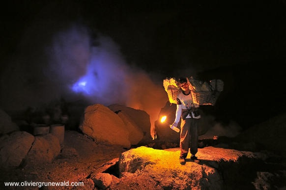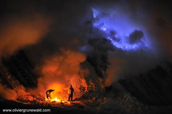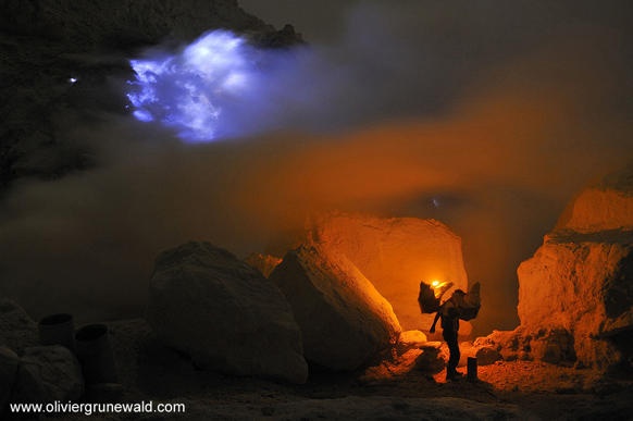 | Trong hơn 40 năm qua, thợ mỏ đã khai thác lưu huỳnh từ miệng núi lửa Kawah ljen. Ảnh: Olivier Grunewald |
