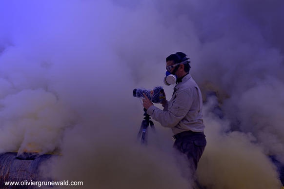 | Nhiếp ảnh gia đeo mặt nạ phòng độc và bọc kỹ máy ảnh khi tác nghiệp tại núi lửa Kawah ljen để làm một phim tài liệu về những ngọn lửa xanh ở đây. Ảnh: Olivier Grunewald |