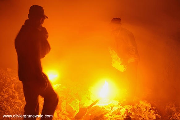 | Để tăng thêm khoản thu nhập nhỏ nhoi, thợ mỏ làm thêm vào buổi tối nhờ ánh sáng mờ ảo từ núi lửa. Ảnh: Olivier Grunewald |