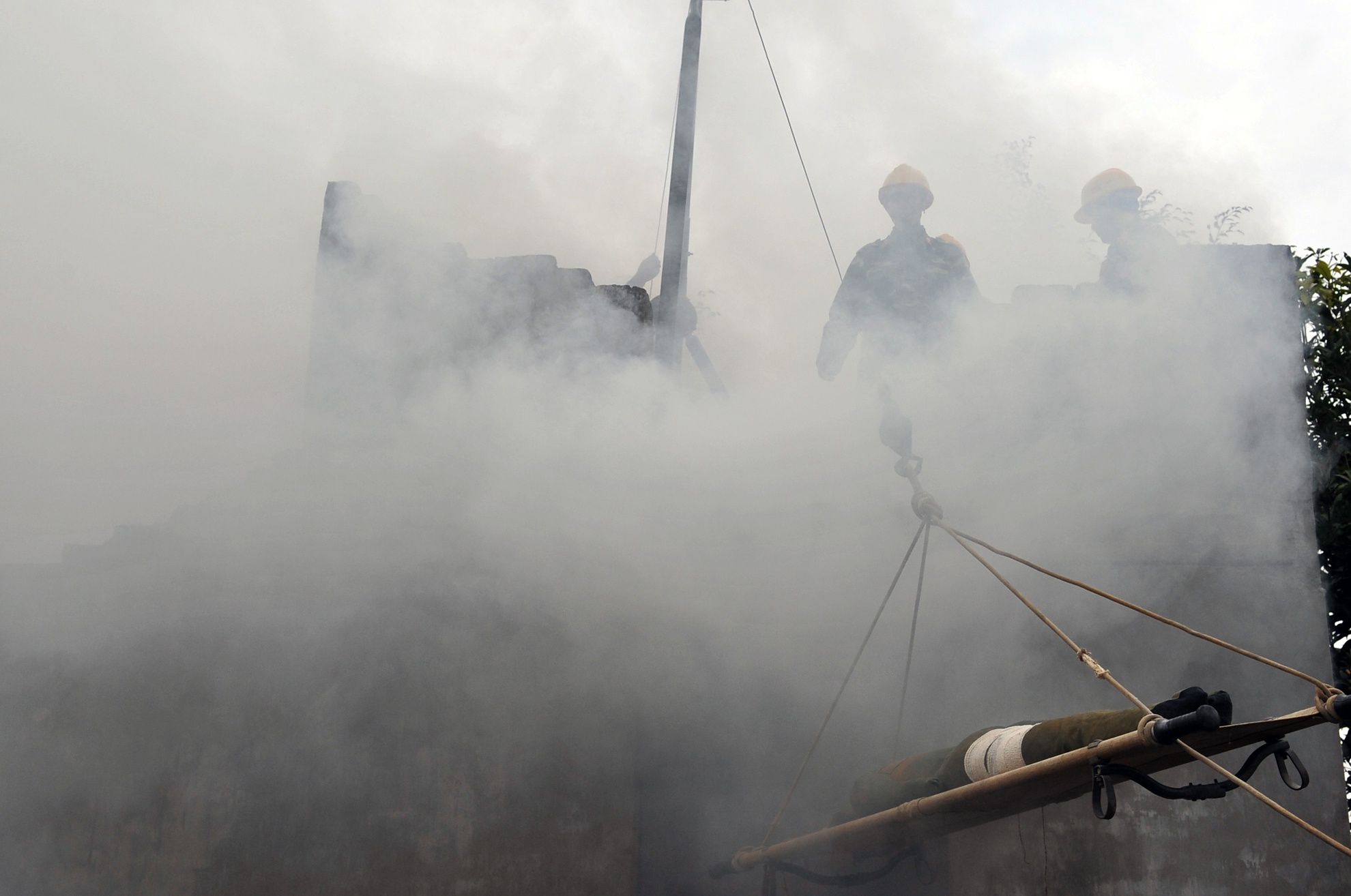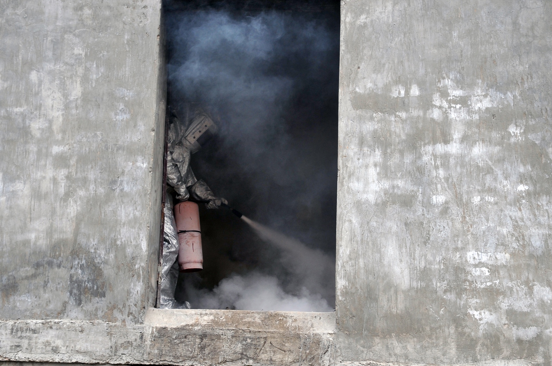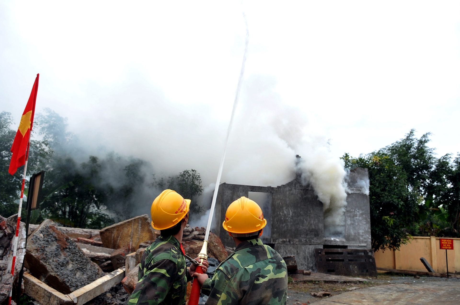 | Trên hình ảnh là buổi diễn tập dập tắt đám cháy ở ngôi nhà hai tầng giả định với cảnh đổ nát, bừa bộn gạch vỡ, vôi vữa, có nhiều nạn nhân bên trong. |