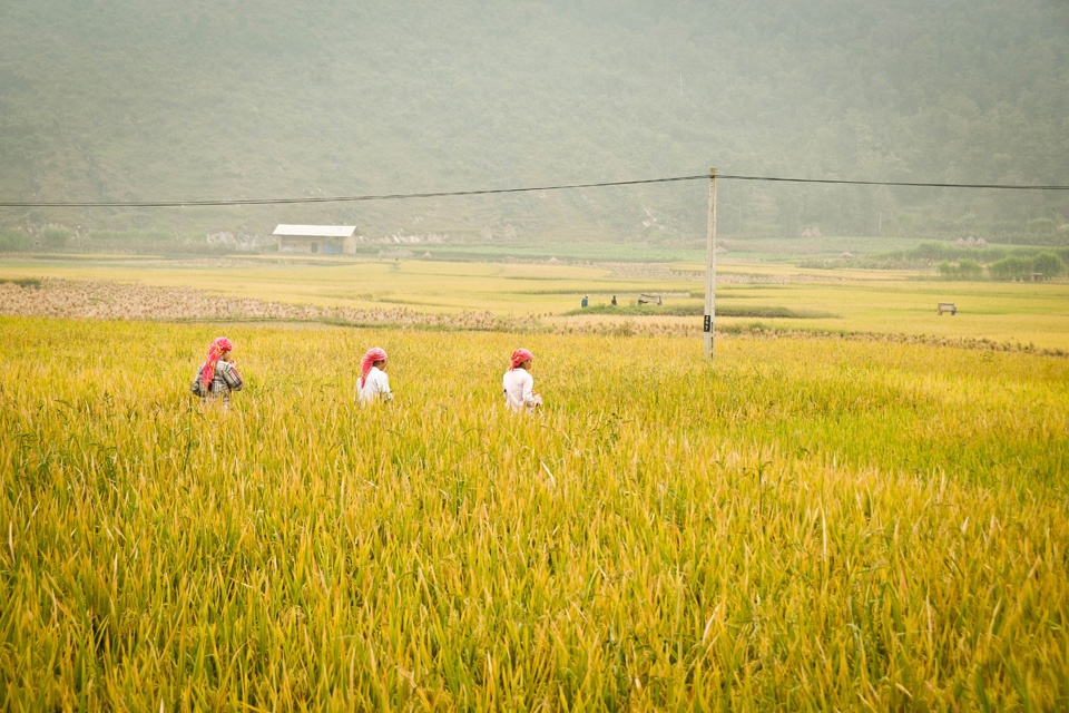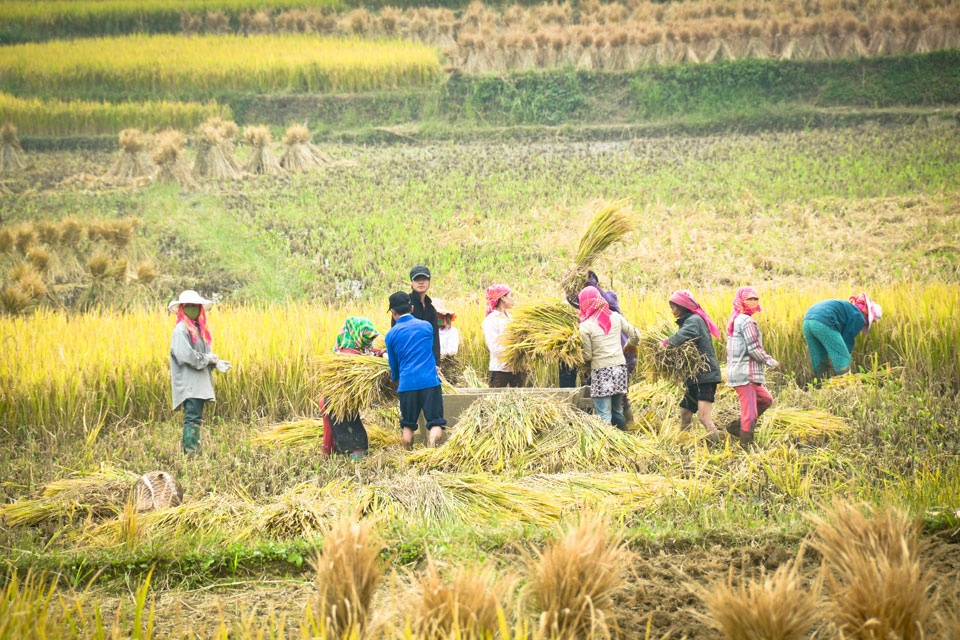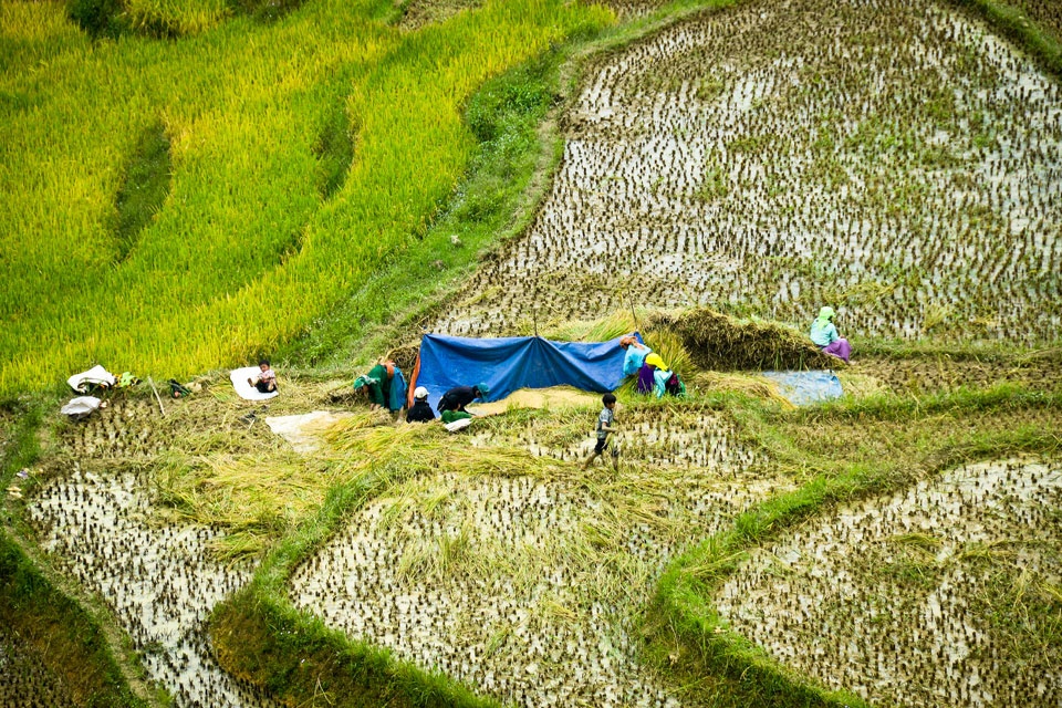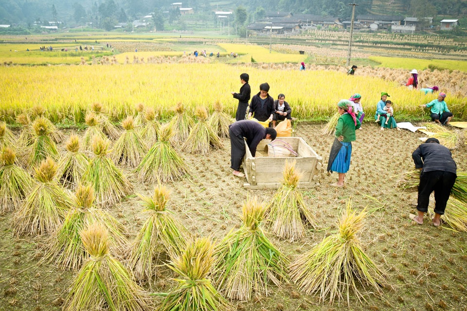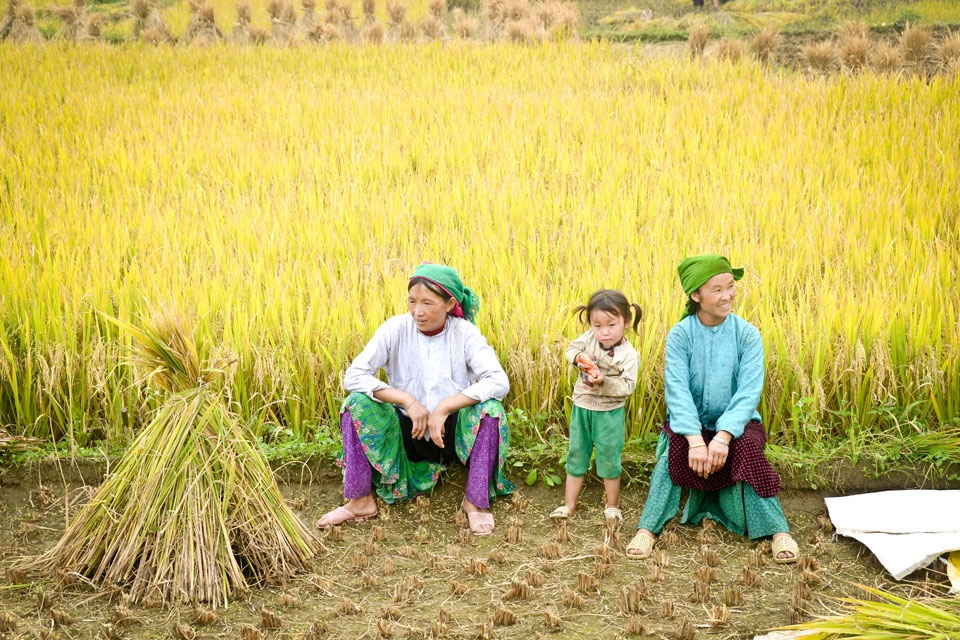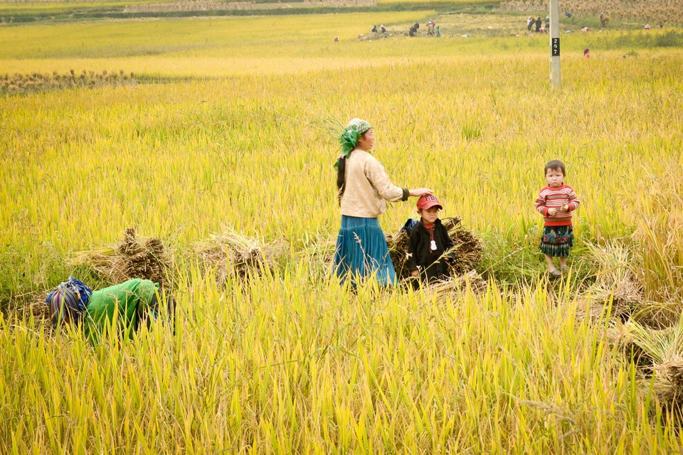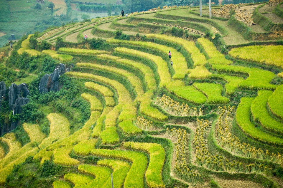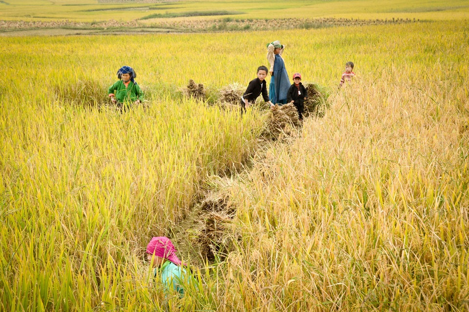 | Ruộng bậc thang ở Lũng Cú, Yên Minh lúa chính vàng chảy tràn trên rẻo cao. Bà con dân tộc nơi đây bắt đầu rộn rã gặt lúa, các em nhỏ cũng ra ruộng phụ giúp gia đình. |