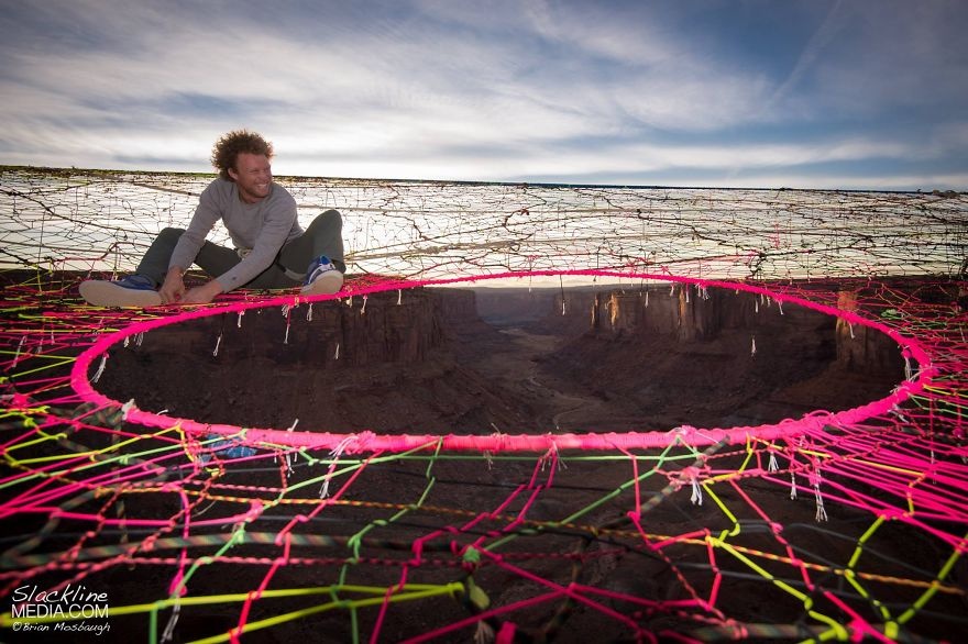 | Moab Monkeys là một nhóm vận động viên ưa mạo hiểm ở Utah. Gần đây họ đã treo một tấm lưới khổng lồ trên một hẻm núi gần Moab, Utah ở độ cao chóng mặt lên tới 122 m. |